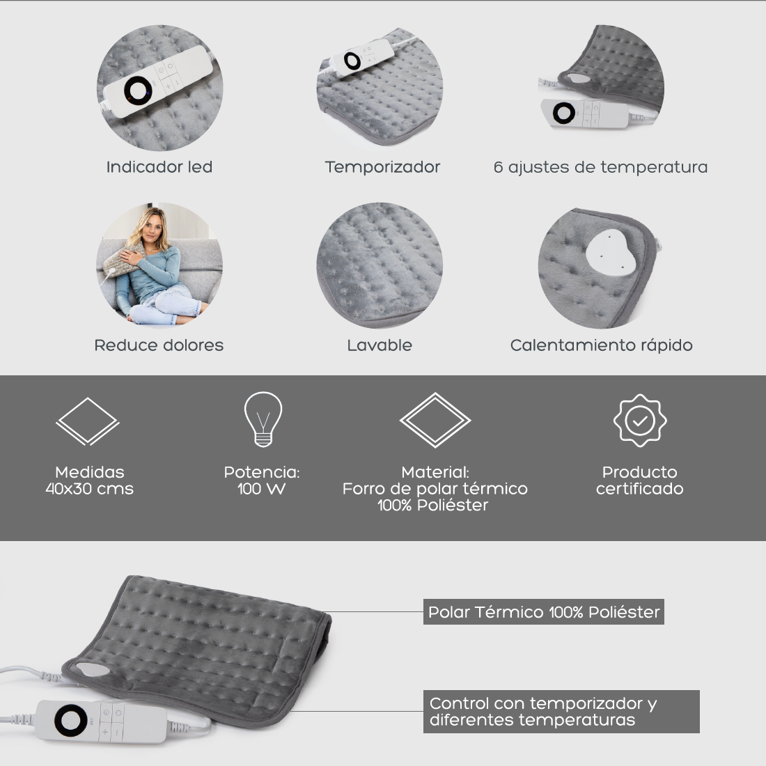 Esta almohadilla dispone de protección contra sobrecalentamiento, lo que garantiza su uso sin riesgos. A la vez, su controlador desmontable la hace completamente lavable. También cuenta con calentamiento rápido, lo que significa que en pocos minutos podrás disfrutar de su agradable sensación de calor y aliviar dolores y molestias musculares.