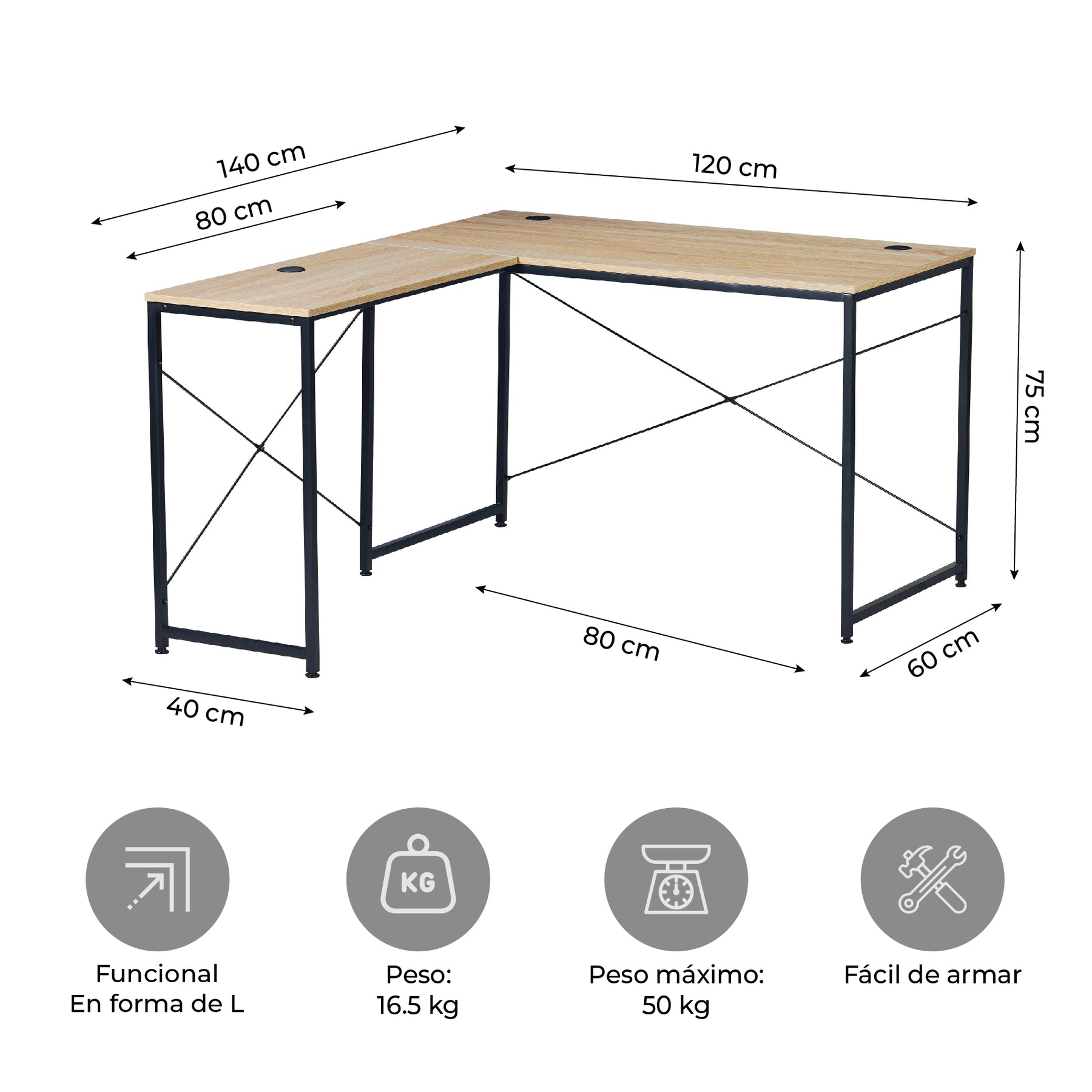 - Largo: 140 cm (esquina uno) / 120 cm (esquina dos)