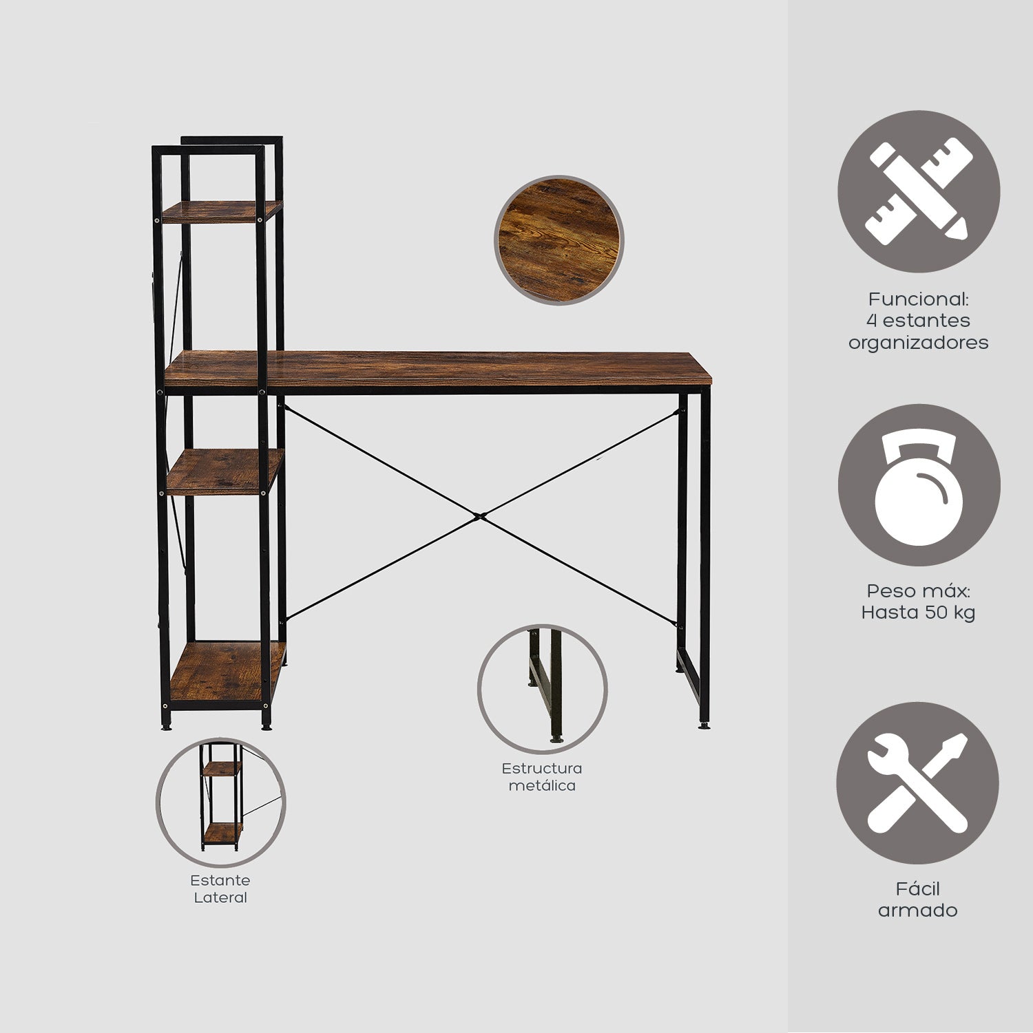 Escritorio Estilo Industrial con Estantería Lateral Desk 4 Caoba