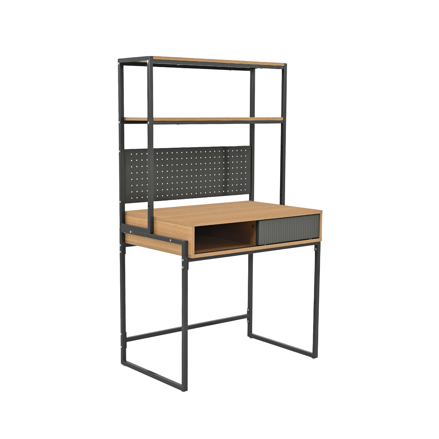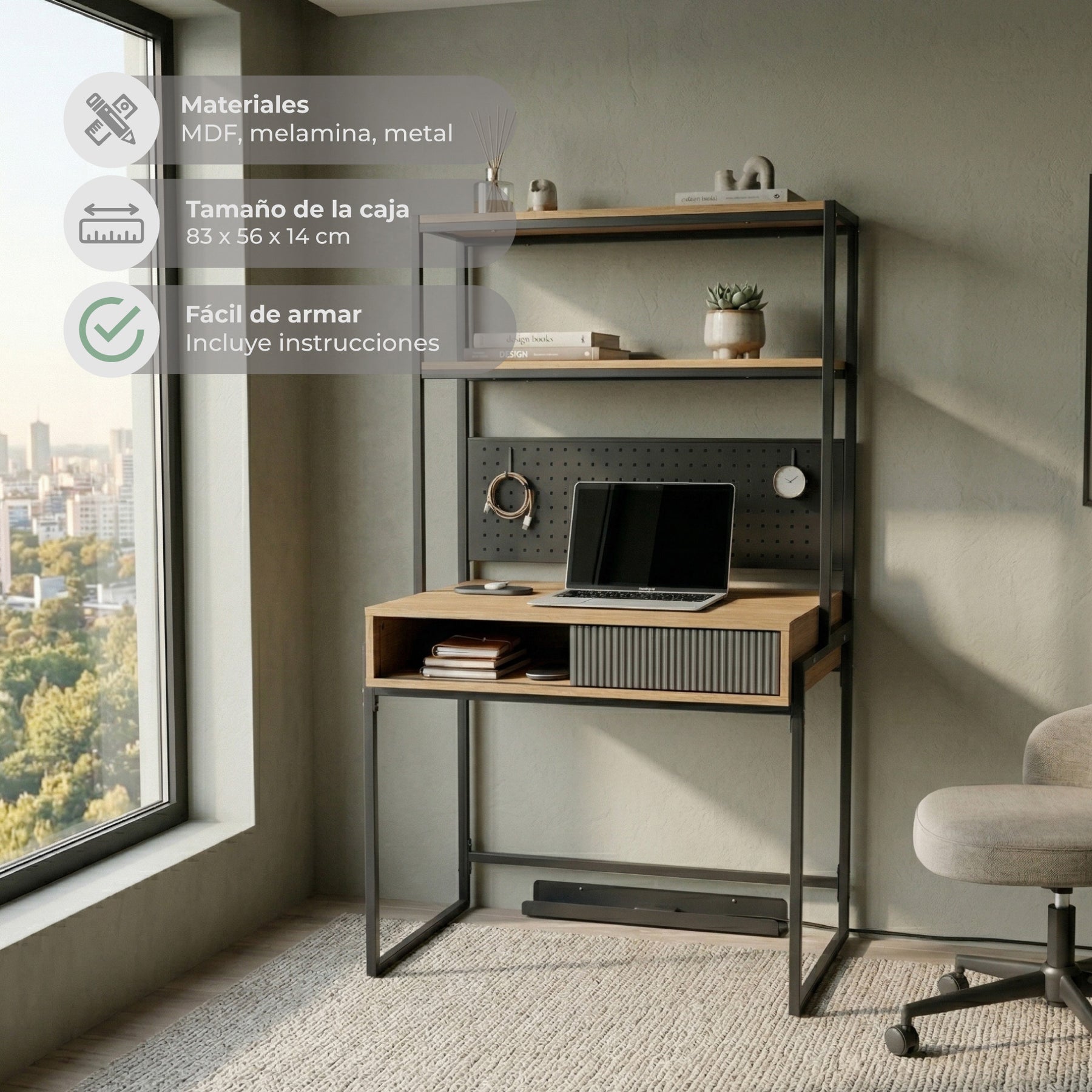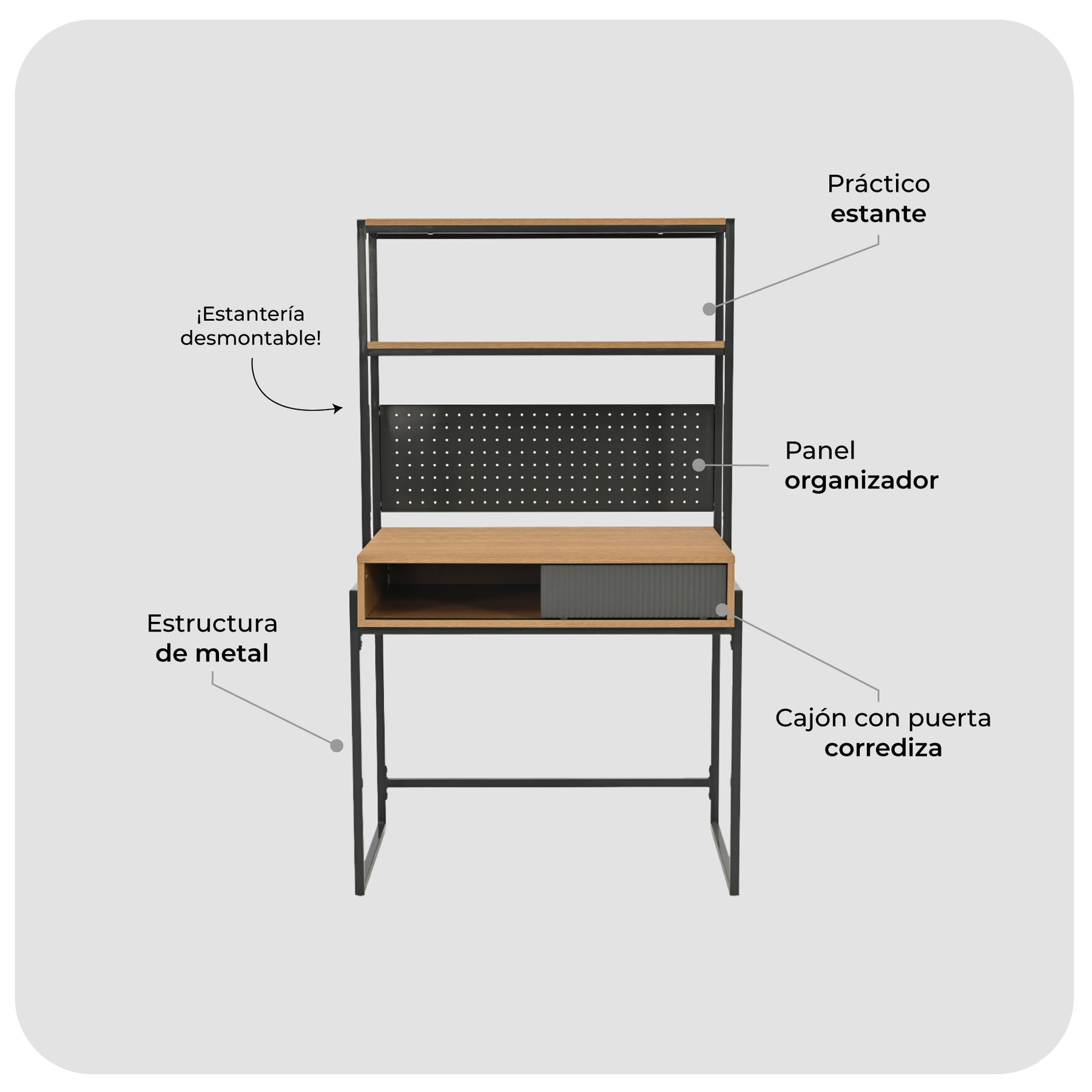 Incluye un módulo superior desmontable, que te permite usarlo como escritorio con estantería o de forma independiente según tus necesidades. Esta flexibilidad lo convierte en una solución ideal tanto para espacios amplios como para ambientes más compactos. Además, cuenta con un práctico cajón y espacio de guardado abierto para mantener todo organizado.