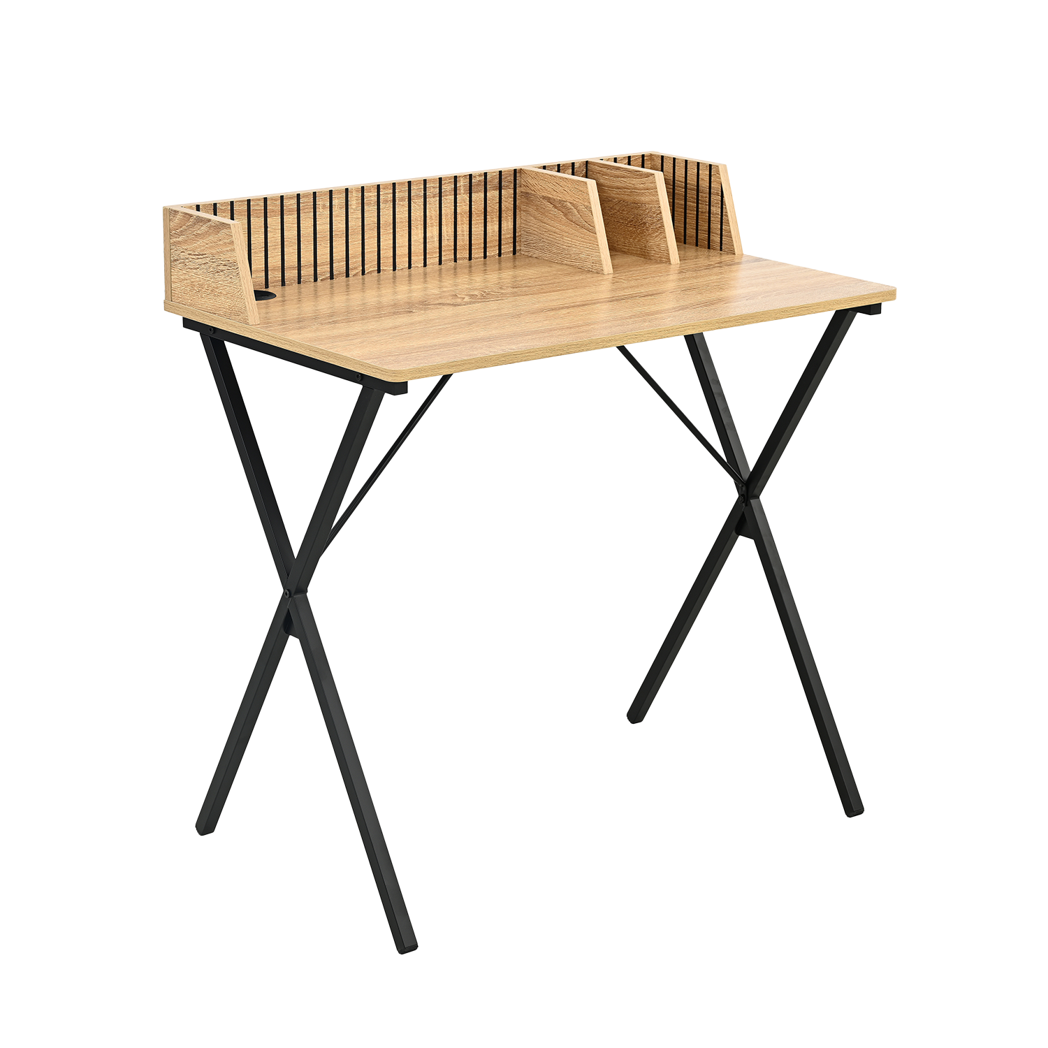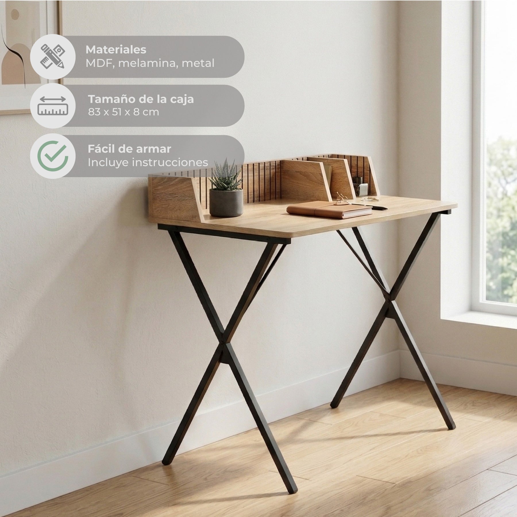 - Amplia superficie de trabajo con acabado simil madera, ideal para estudio o home office.