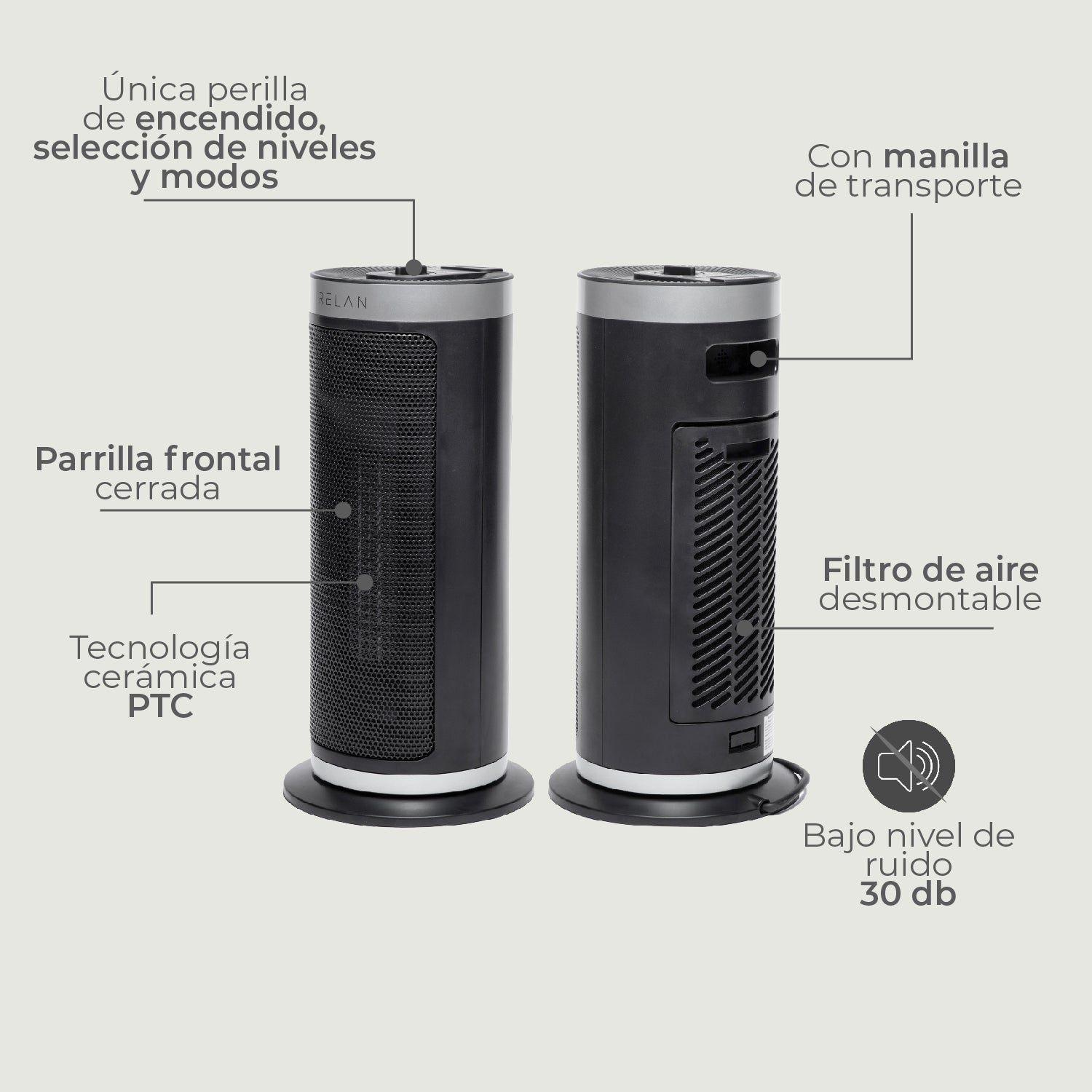 - Diseño cilíndrico con movimientos oscilantes en ángulo de 70°, lo que ayuda a distribuir el calor de forma pareja en todo el ambiente