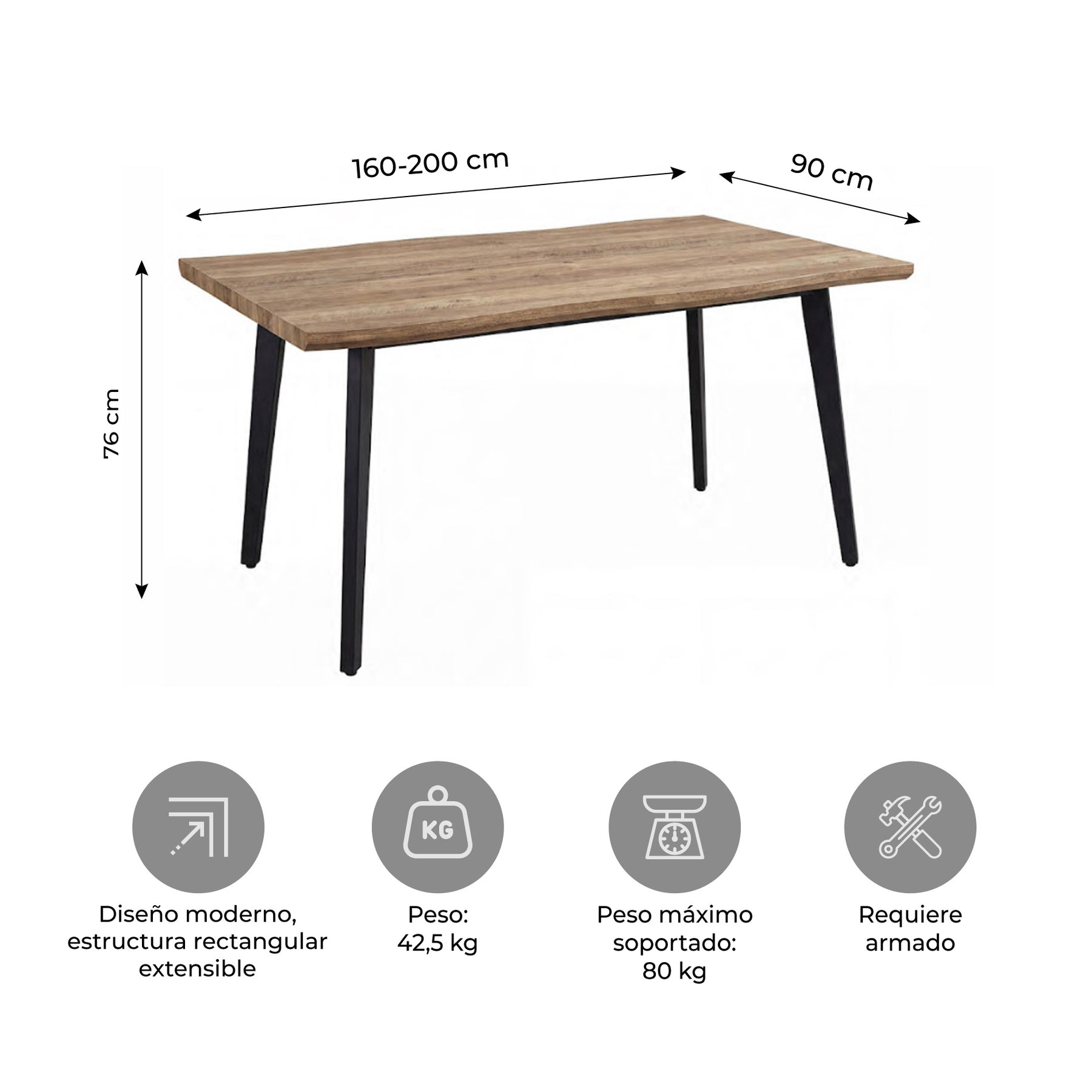 - Estructura rectangular extensible, permite modificar su largo de 160 cm a 200 cm