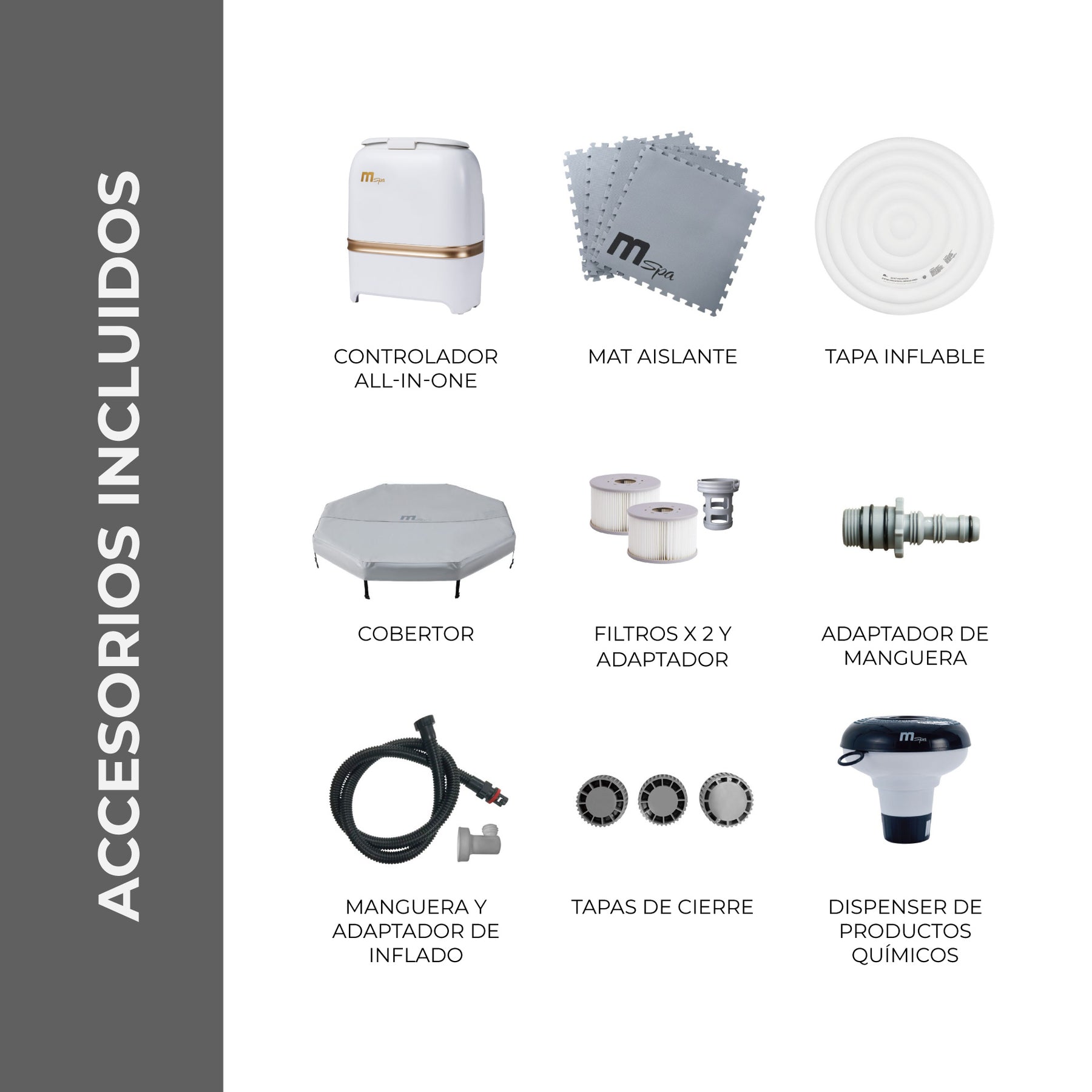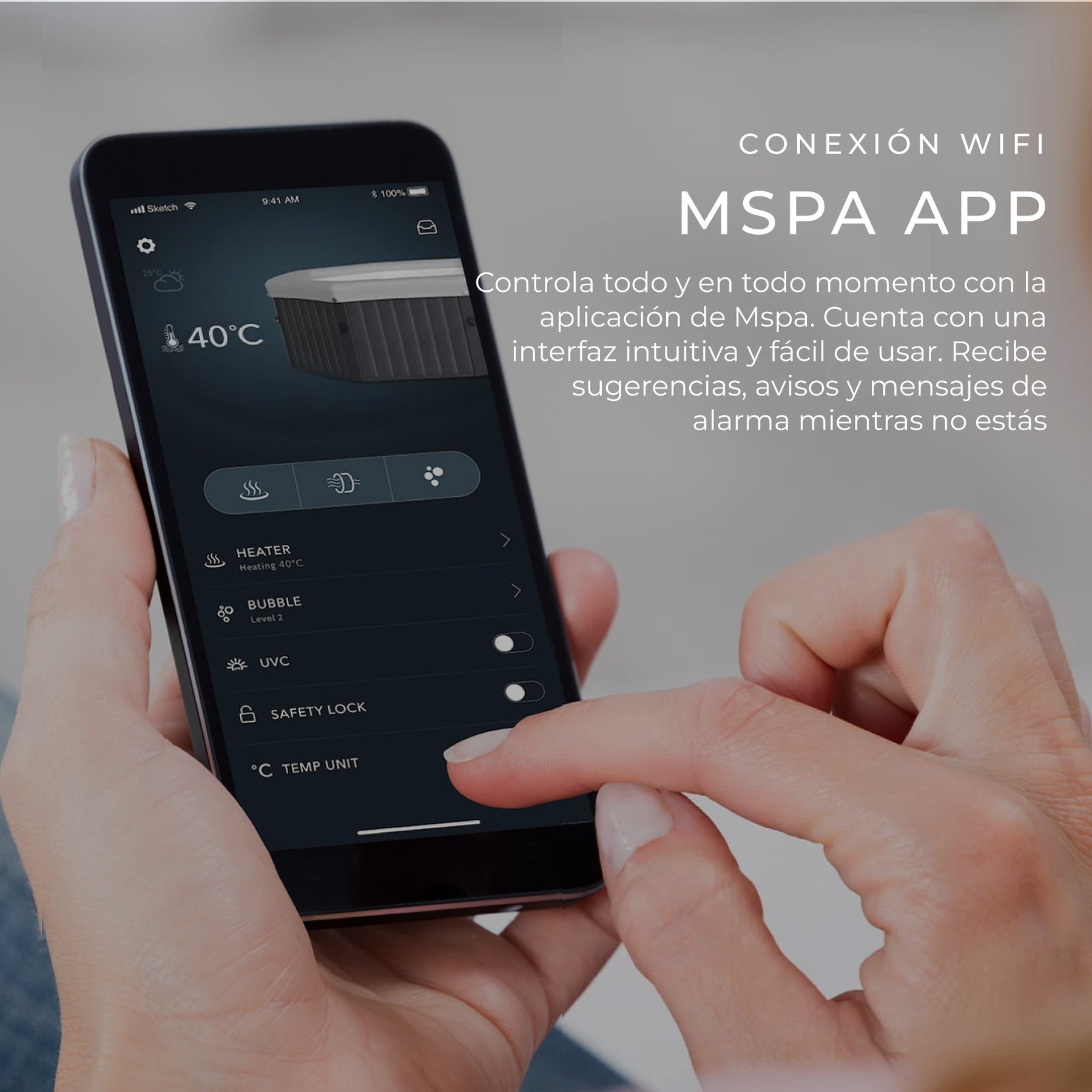 Este spa está equipado con limpieza a través de filtración inteligente y sanitizador UVC para mantenerlo limpio y seguro. Puedes controlarlo a través de su controlador incorporado o mediante su app exclusiva que se conecta por medio de wifi.