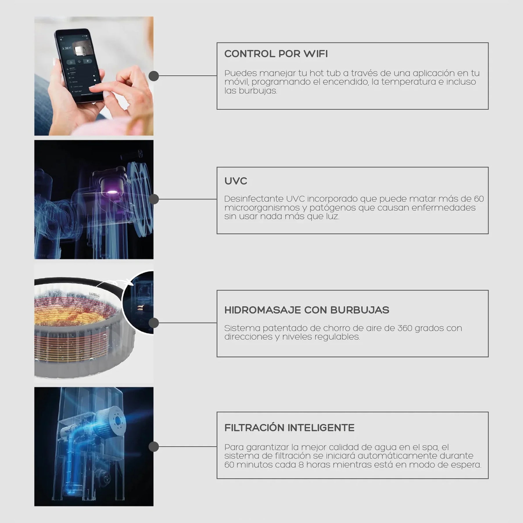 Este SPA cuenta con todos los detalles para convertirlo en un jacuzzi de lujo. Disfruta de este hot tub en el sector de tu hogar que más te guste. Cuenta con capacidad para 6 personas y es apto para exterior gracias a sus materiales de fabricación de alta calidad.