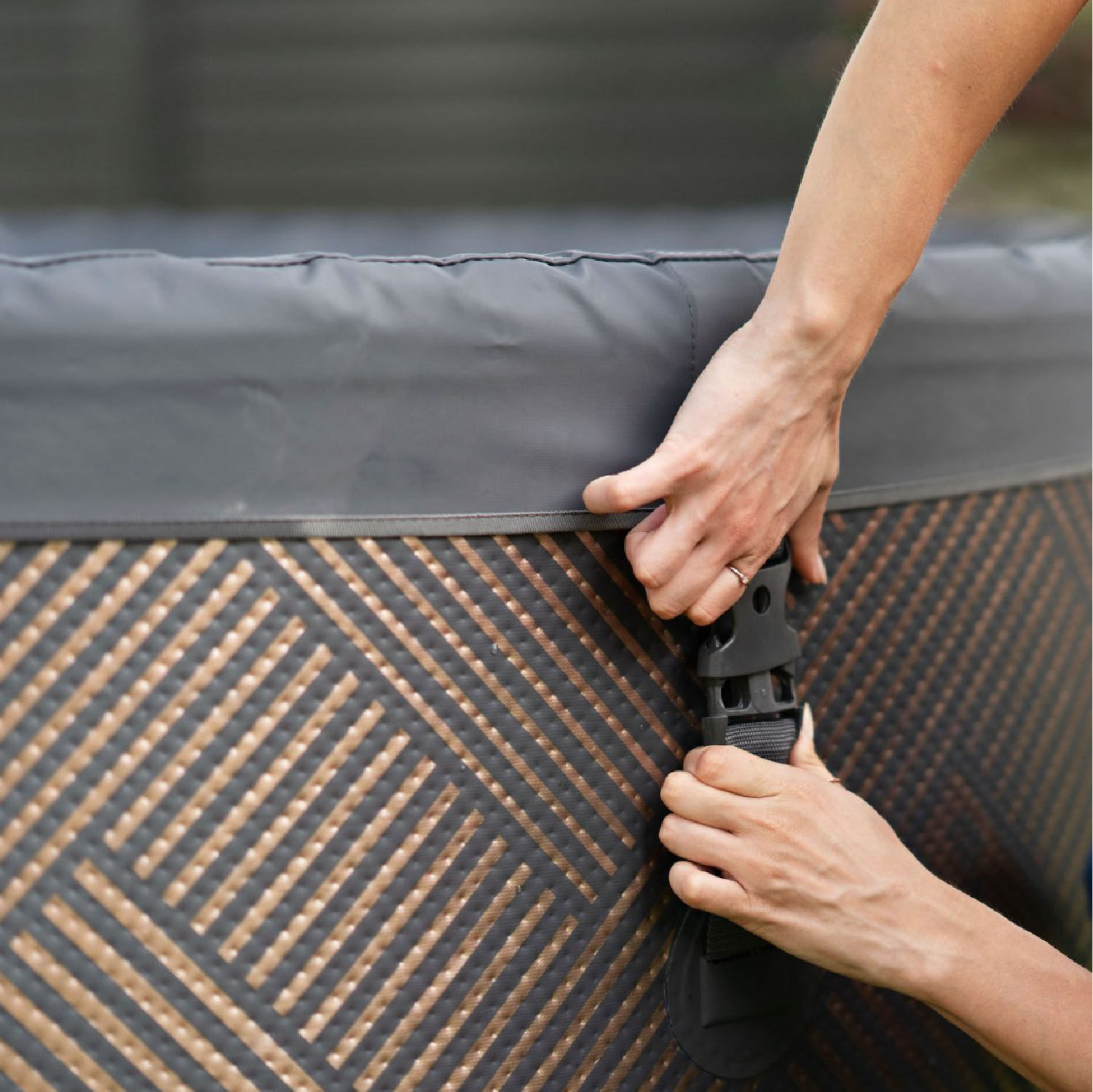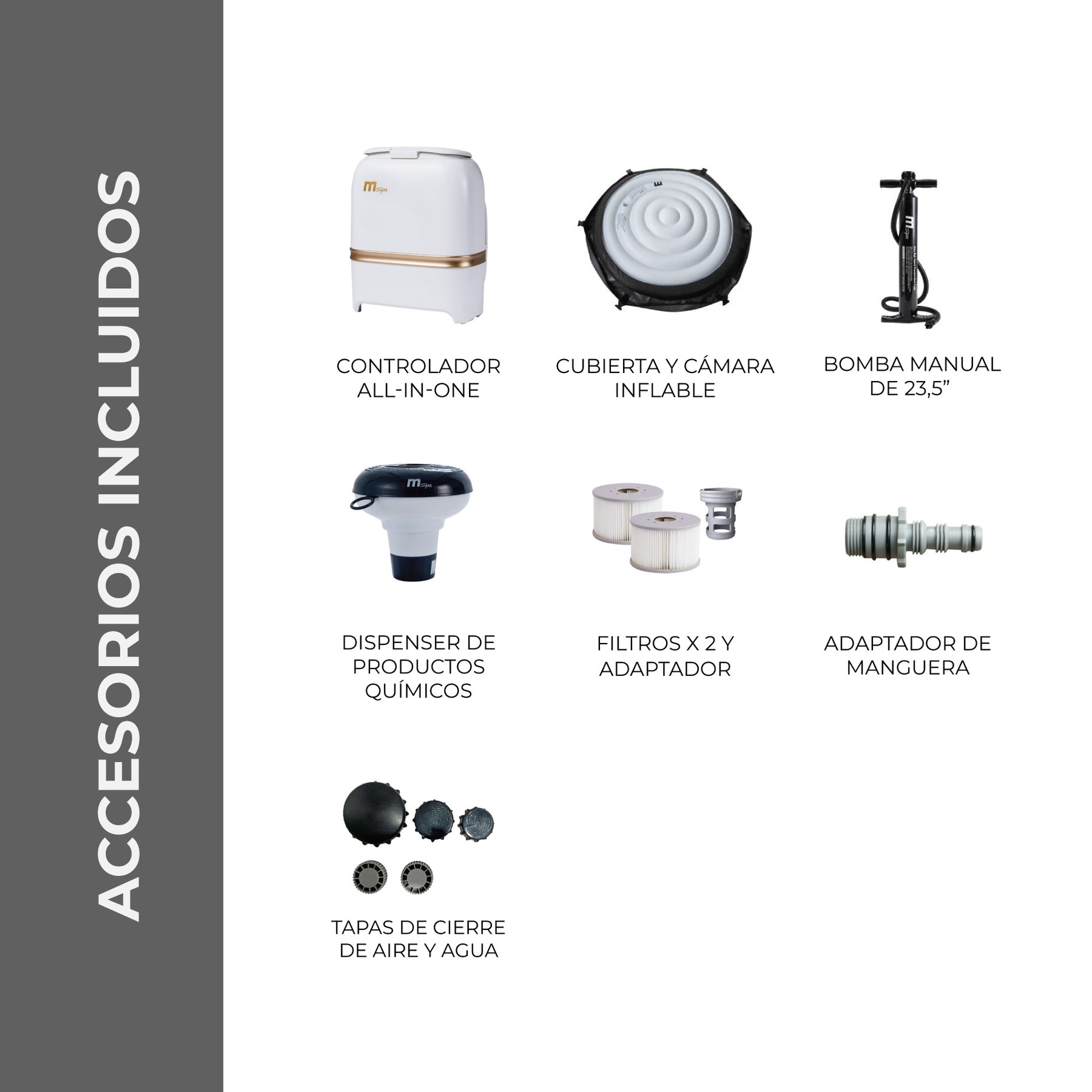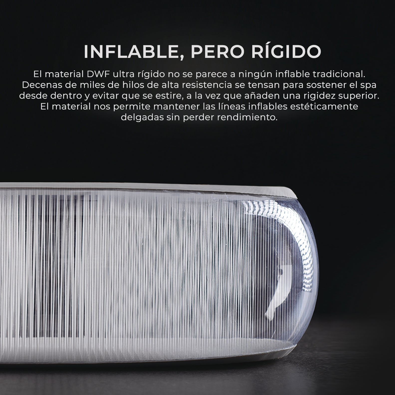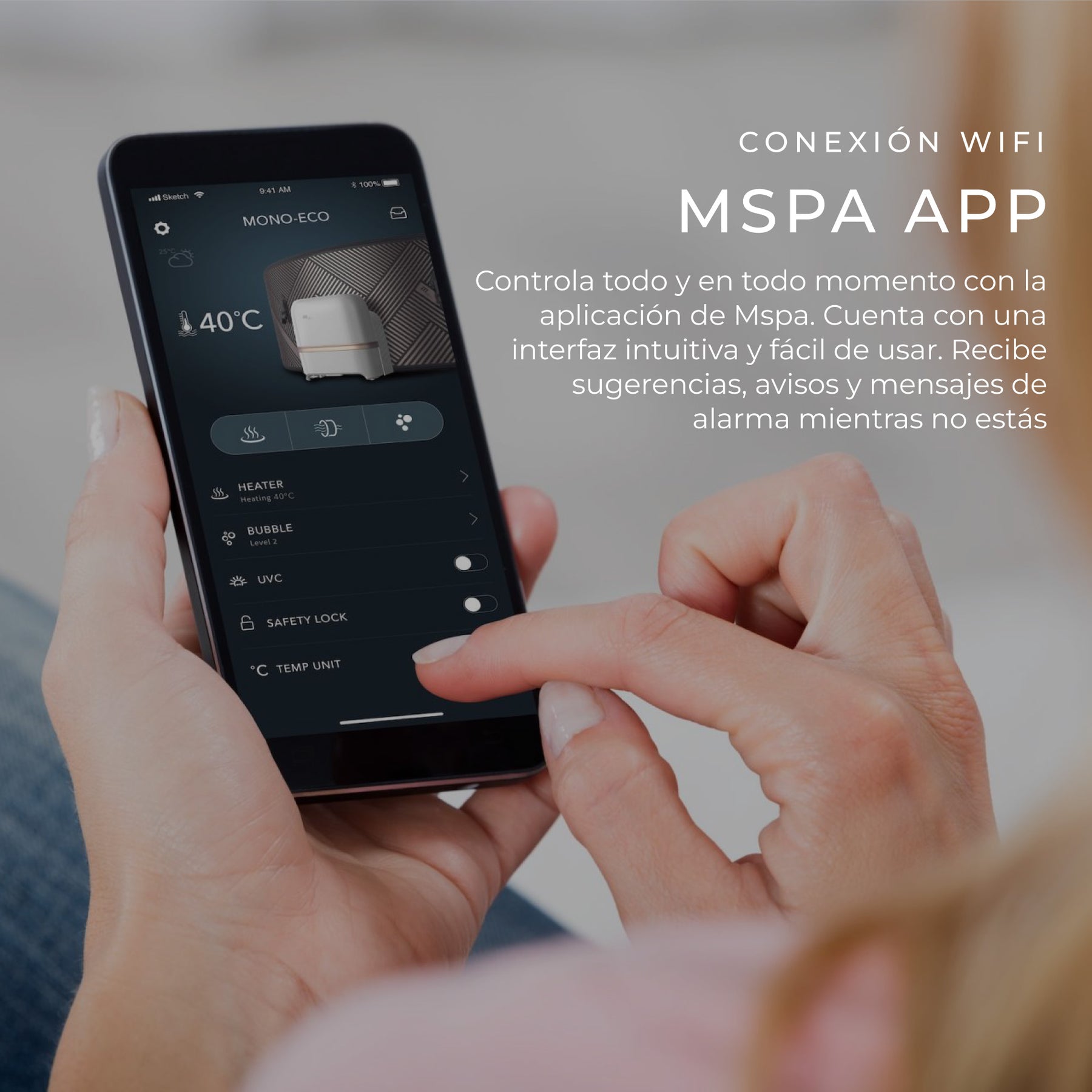 Con las rayas metálicas en la pared exterior texturizada gris hierro, Mono Wifi es un modernista de la bañera de hidromasaje inflable. No importa si se coloca en interiores o exteriores, la versión Mono Wifi ilumina su casa con el concepto revolucionario.