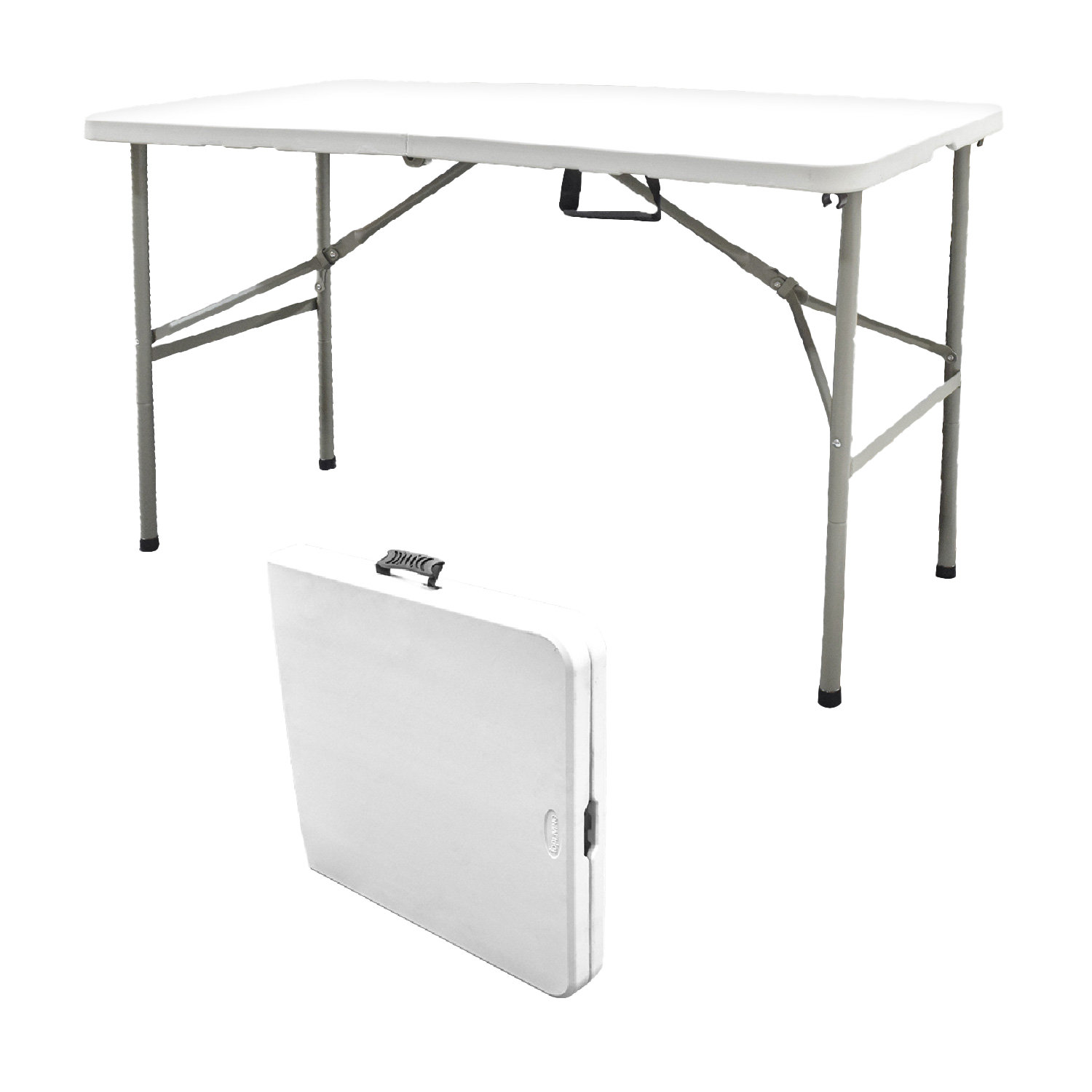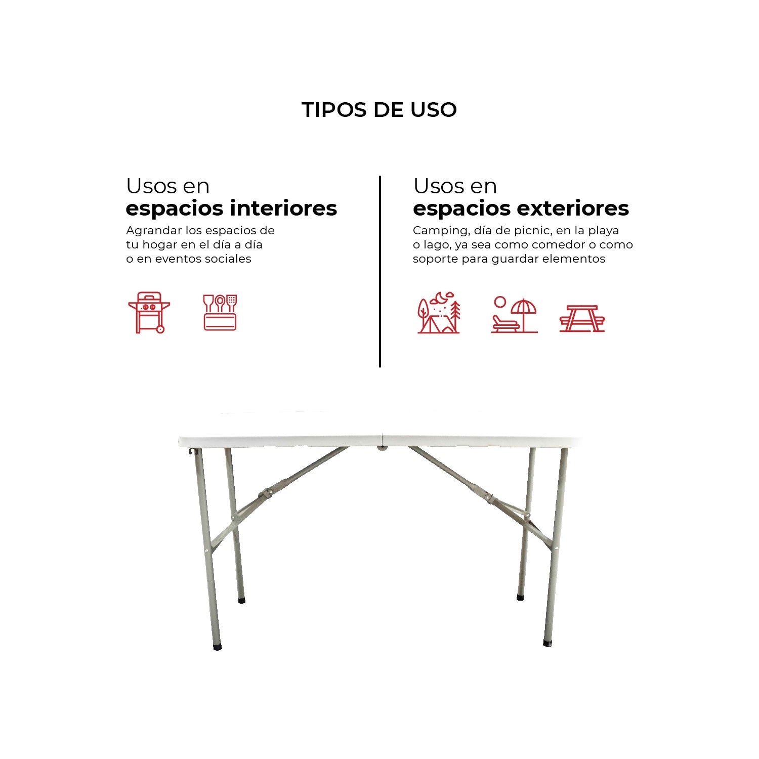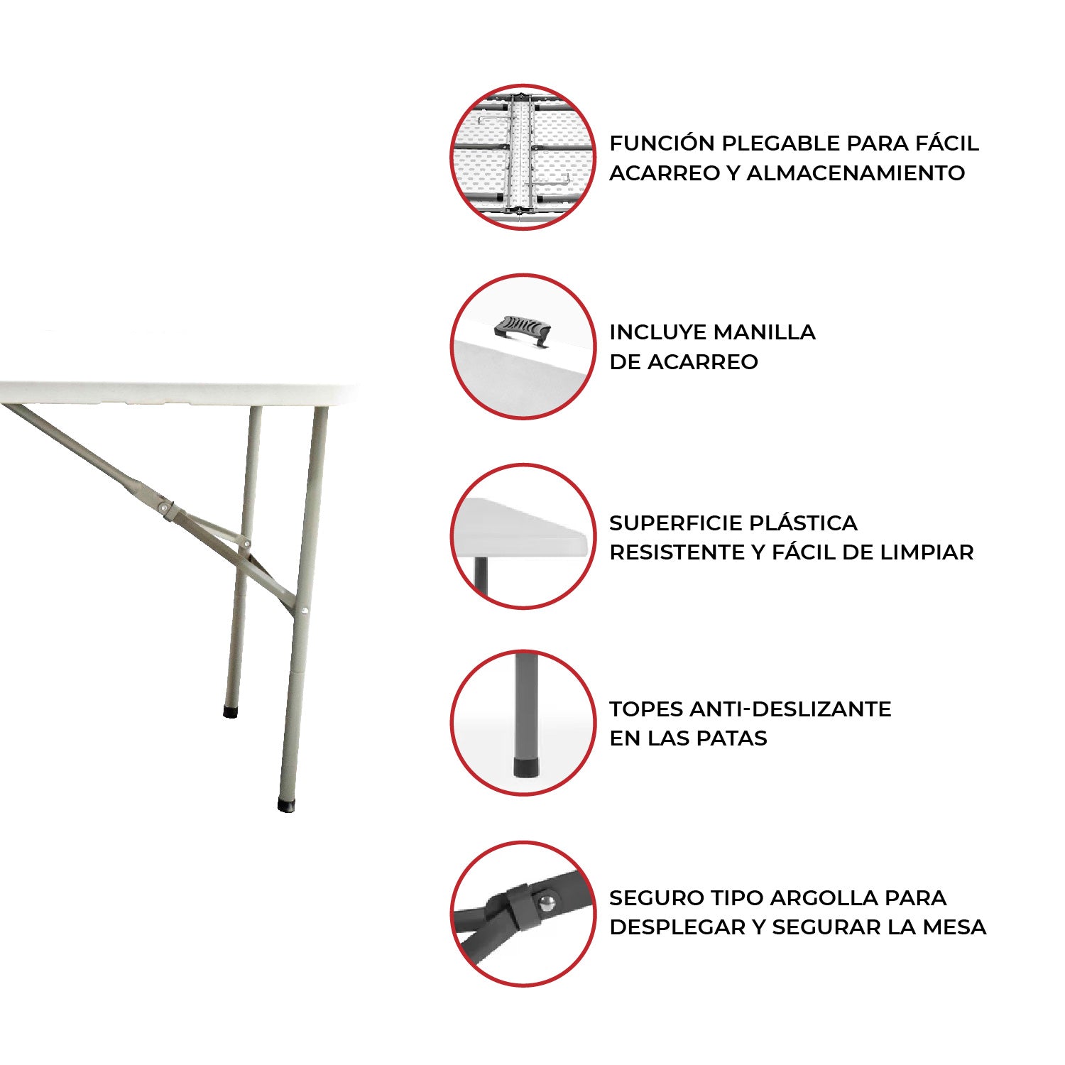 Disfruta de esta práctica mesa plegable de plástico blanca, ideal para disfrutar de agradables momentos con amigos o en familia.