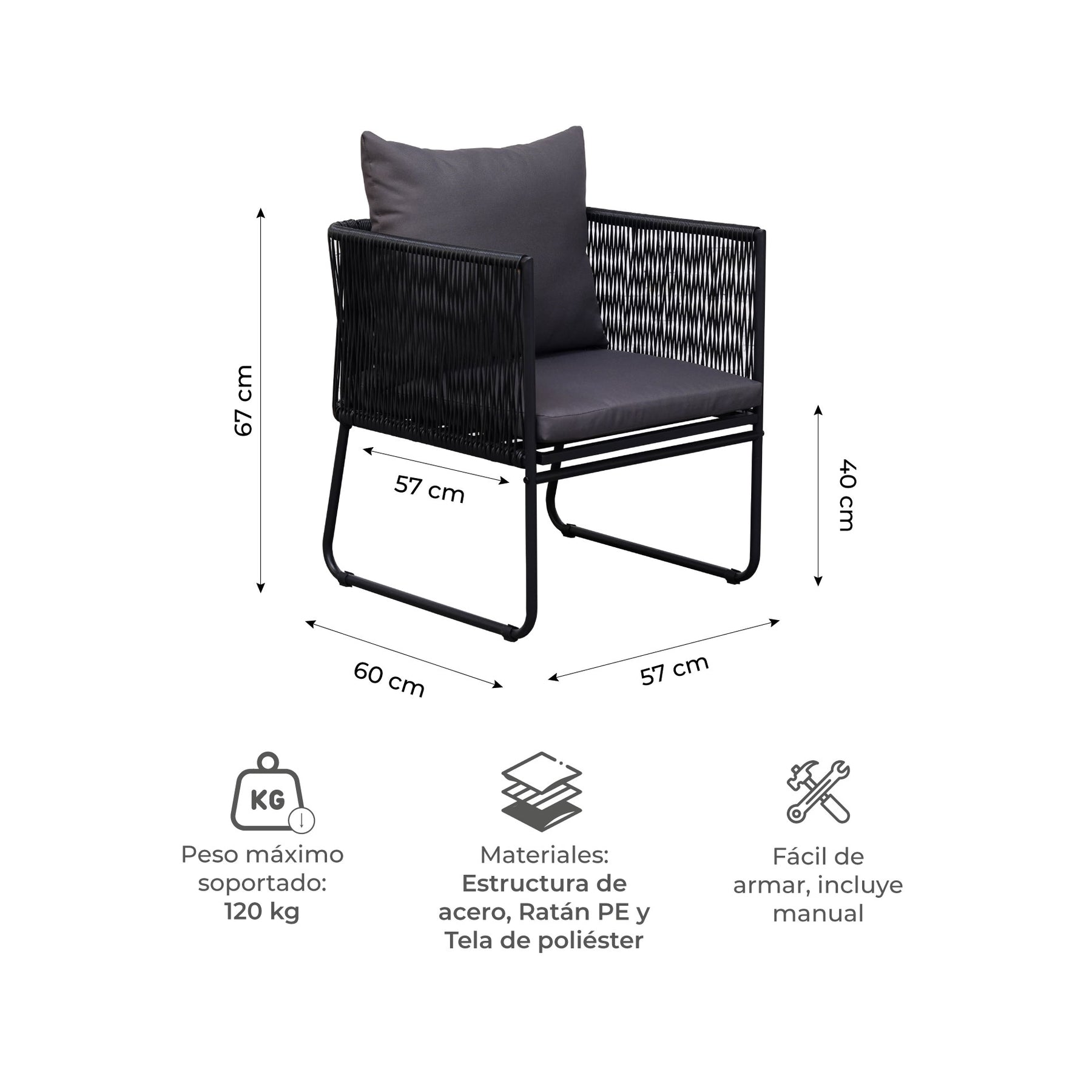 - Materiales: Ratán PE, Acero, Tela de poliéster