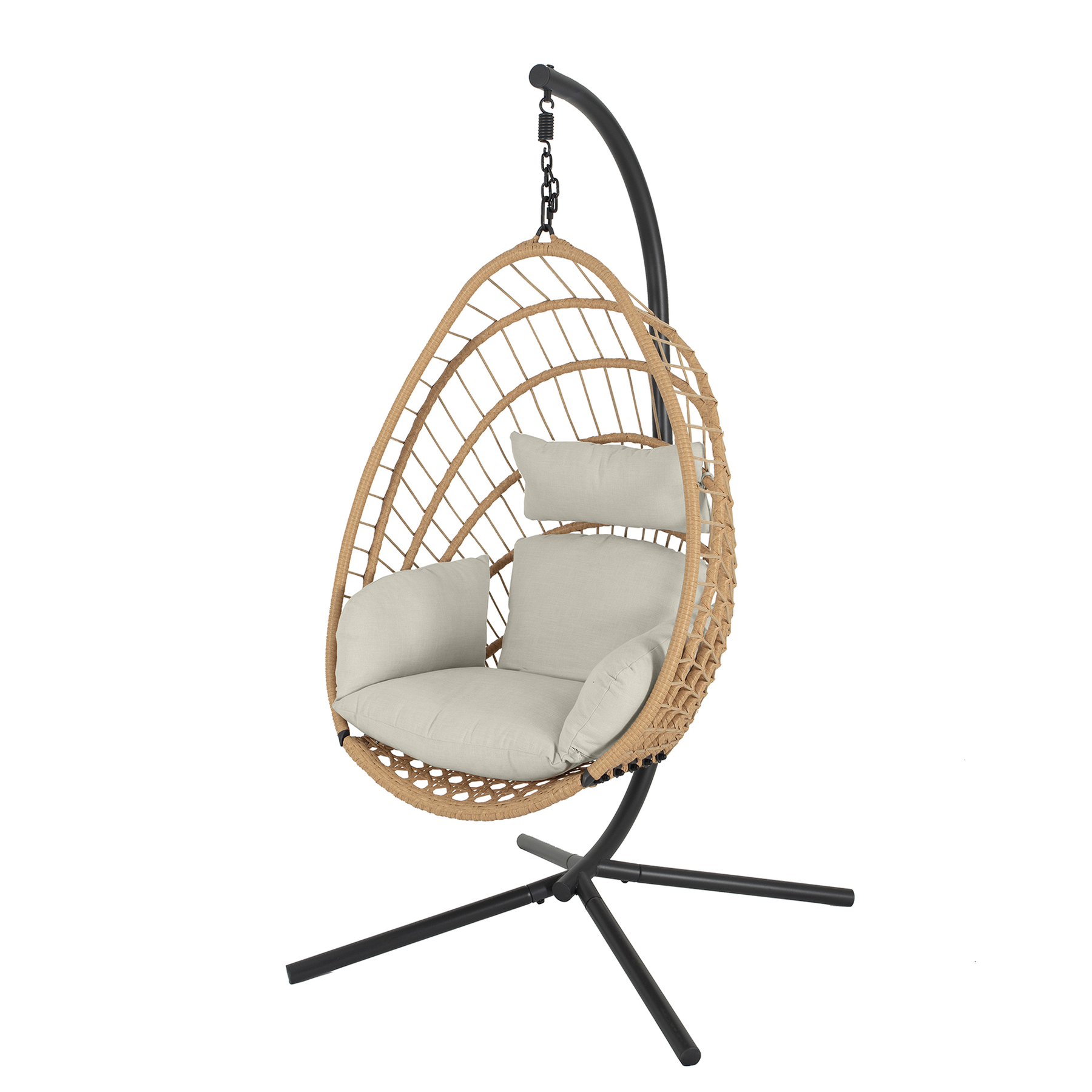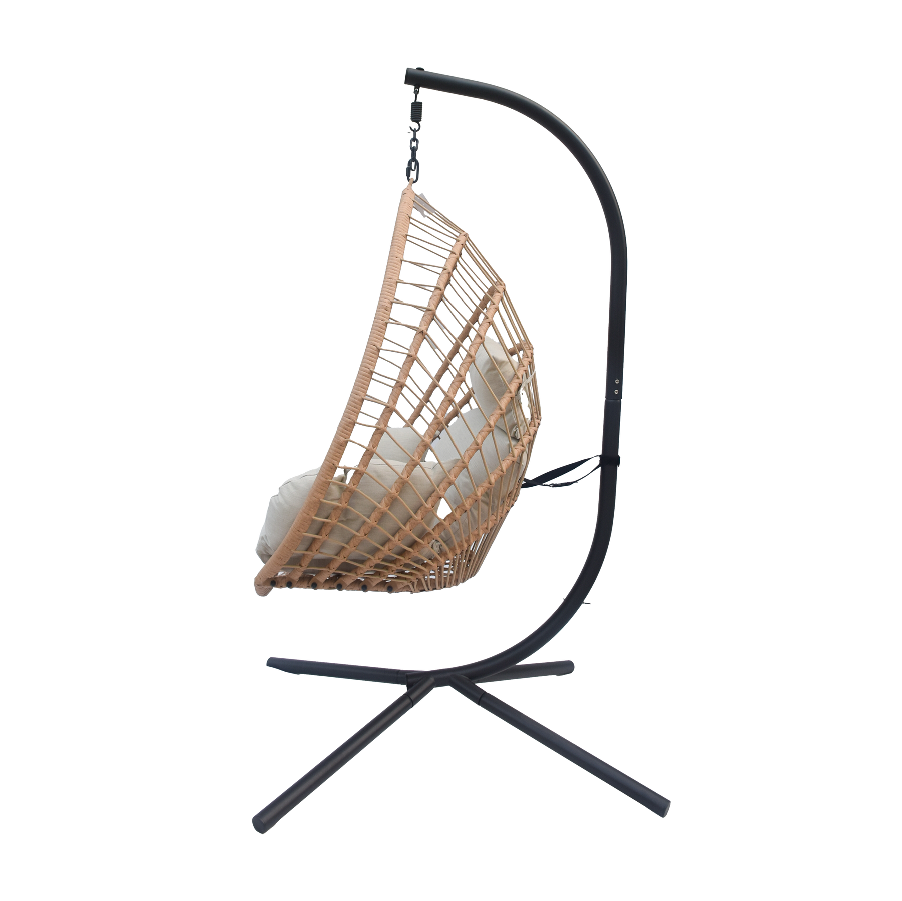 Cuenta con un soporte de pedestal en forma de C fabricado en acero, que soporta hasta 130 kg. El canasto es de acero revestido en mimbre y cuerda, lo que lo hacen resistente y super estético. También incluye 2 cojines para que su comodidad sea increíble.