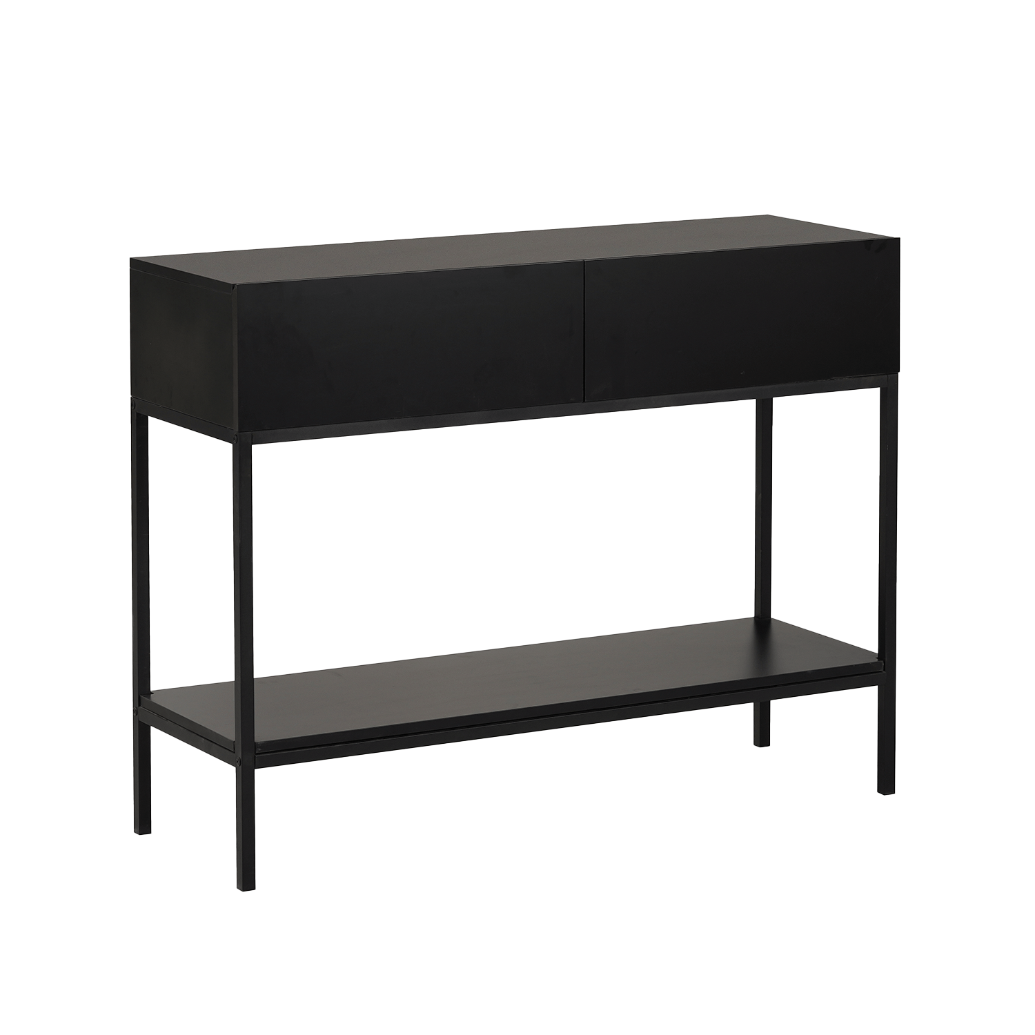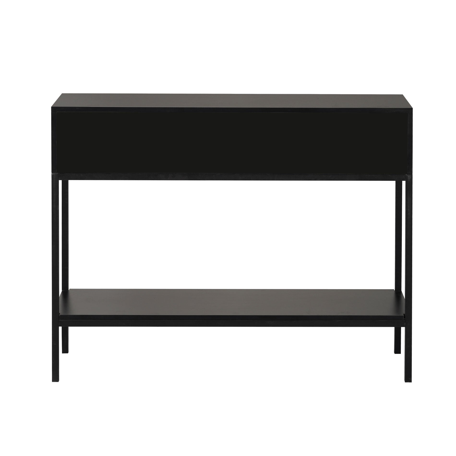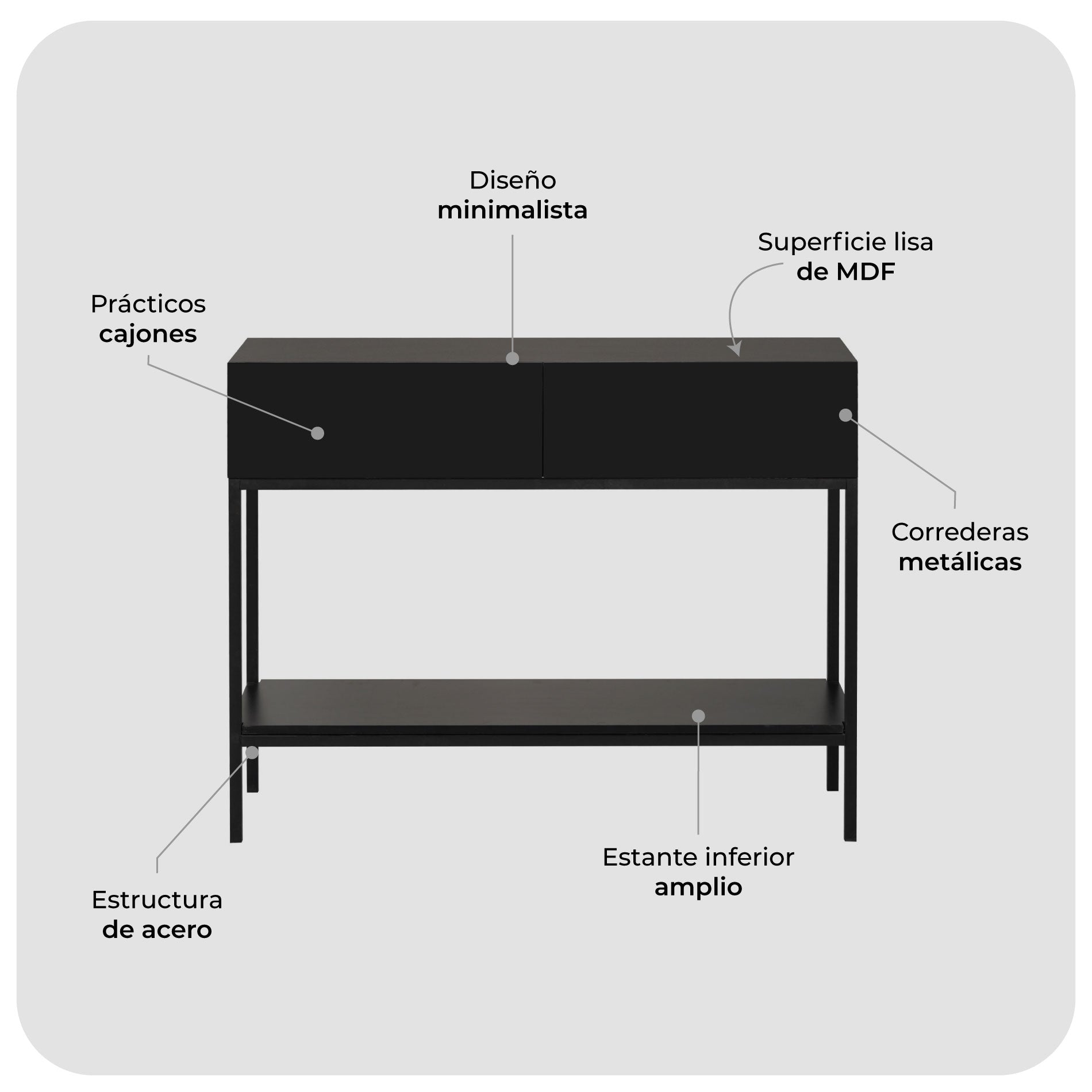 - Cuenta con estante inferior y dos prácticos cajones con manija y correderas metálicas para asegurar una apertura y cierre suave