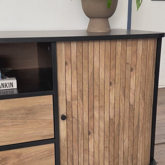 Crea un espacio moderno y sofisticado con el Buffet EBONY by Top Living. Podrás colocar este mueble en la sala de estar, entrada o dormitorio, ya que es un mueble muy versátil. Está diseñada con amplios espacios de almacenamiento que te permitirán mantener tus ambientes visiblemente ordenados. Cuenta con 2 cajones simil madera con guías metálicas y 2 puertas corredizas.