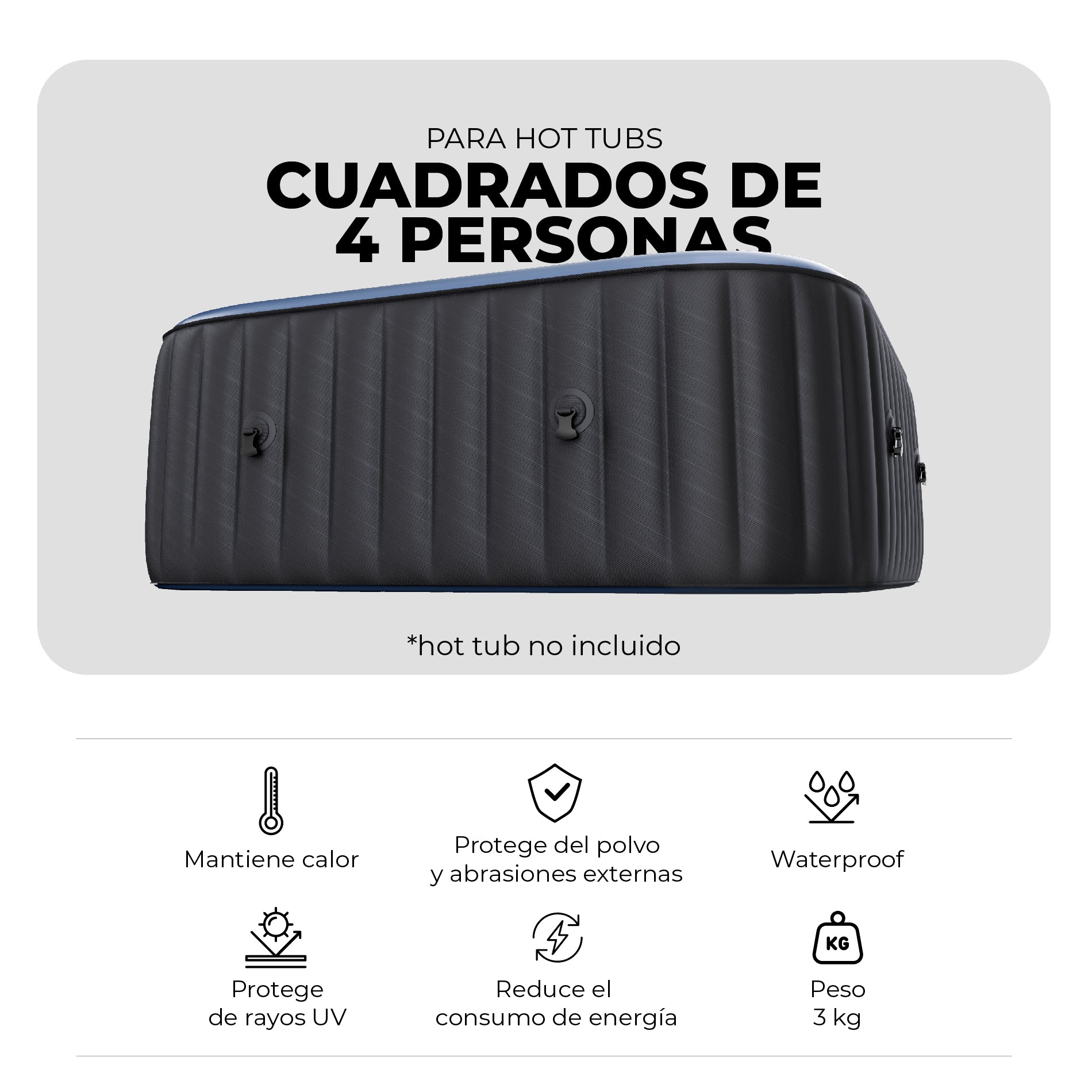 Protege tu SPA y mantén su temperatura cálida mientras no lo usas con el Cobertor Térmico para Hot Tubs Cuadrados de 4 Personas MSpa. Con esta funda de Hot Tub puedes ahorrar hasta 50% de energía simplemente preservando la temperatura del agua y protegiéndola de hojas y polvo.