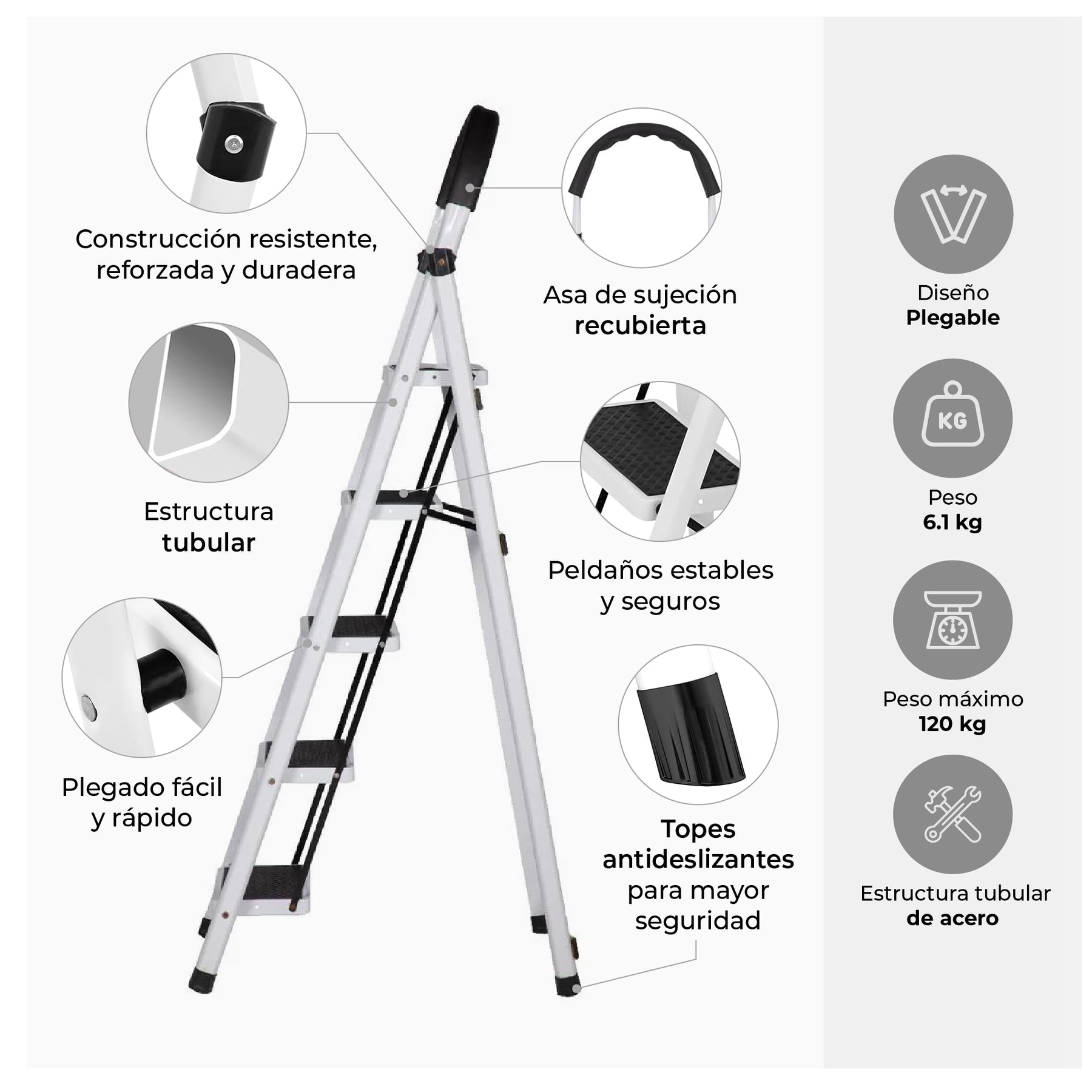 - 5 Escalones anchos y resistentes, con antideslizante que previene caídas y resbalones.