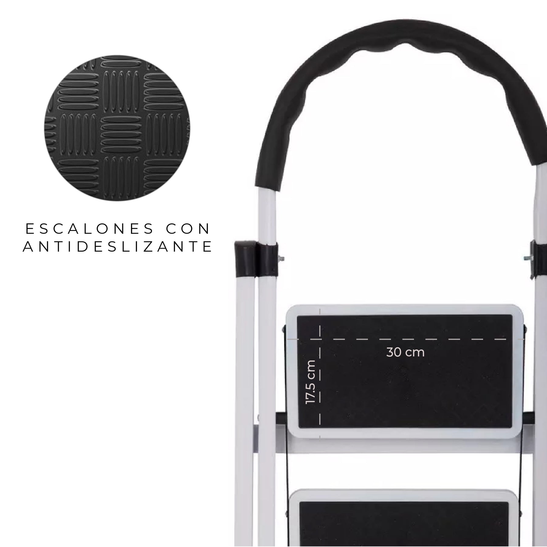 - SEGURA: esta escalera cuenta con cinco peldaños antideslizantes, para evitar caídas, al igual que tacones antideslizantes en sus patas, para evitar movimientos y que puedas trabajar de la manera más cómoda y segura.