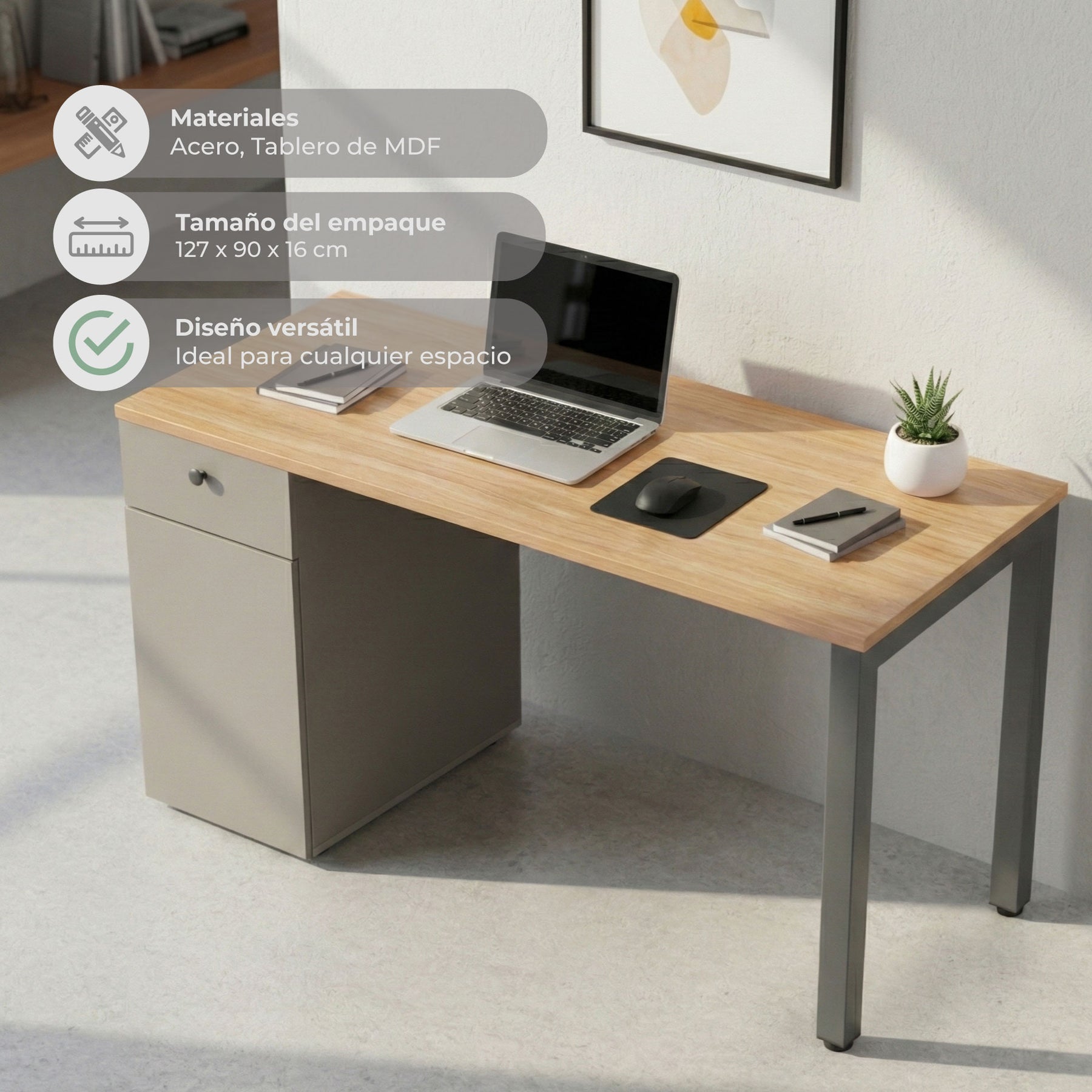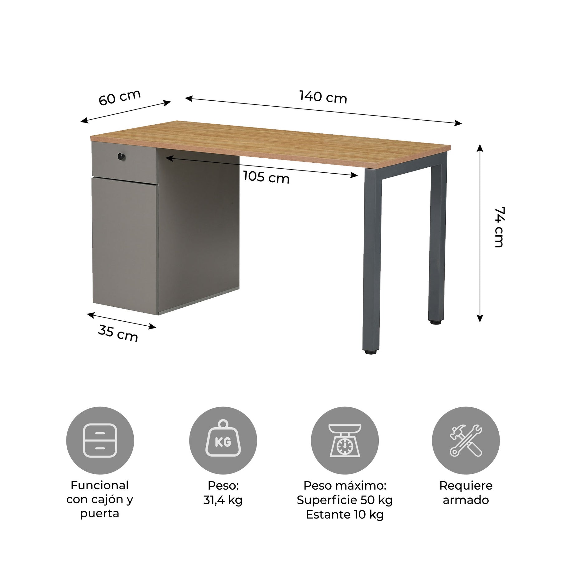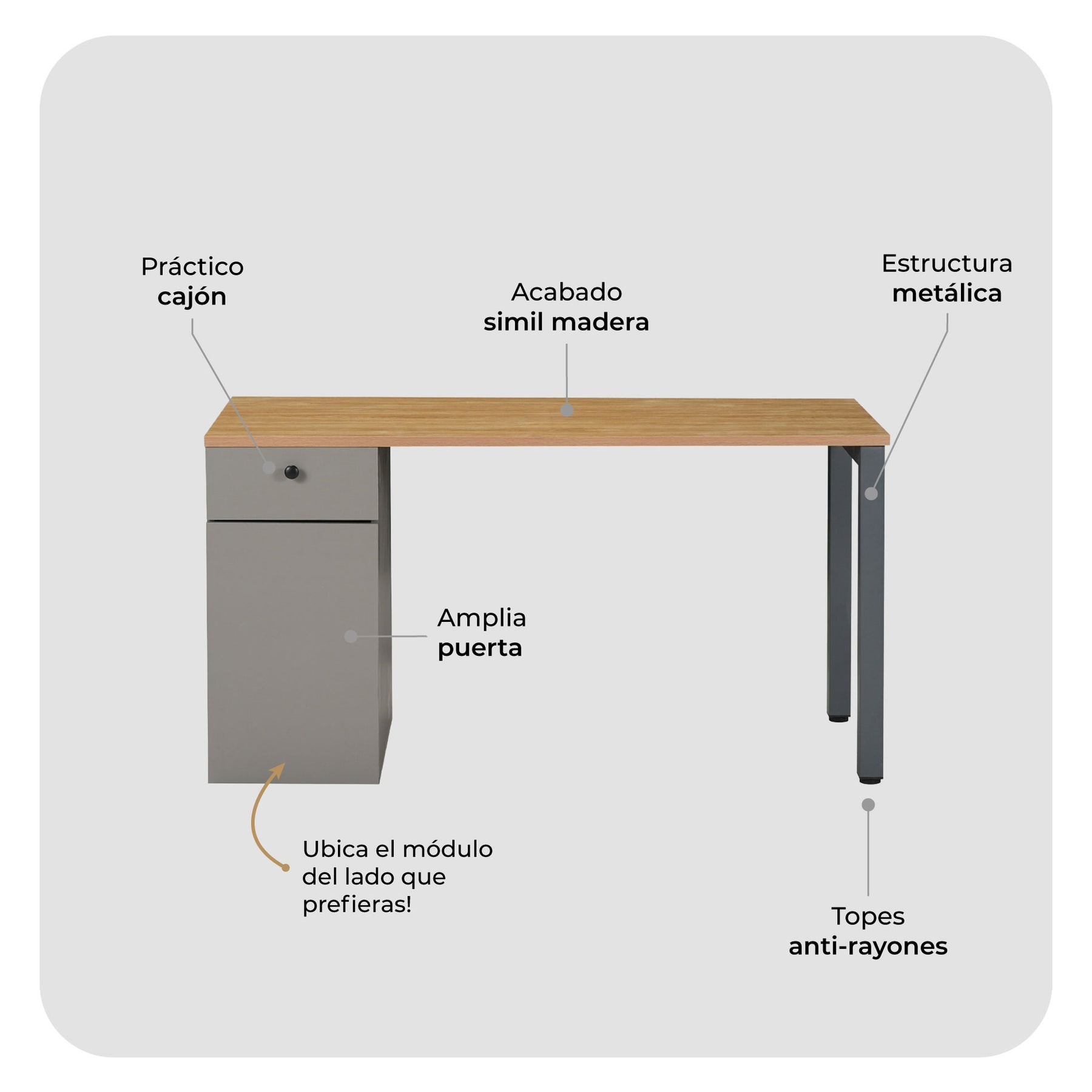 Dale a tu espacio de trabajo un upgrade con este escritorio funcional by Ergonomus. Su amplia superficie con acabado símil madera ofrece un aspecto cálido, mientras que su estructura metálica asegura estabilidad y resistencia. Incluye un práctico módulo lateral con espacio de guardado que te permite mantener todo organizado. Ideal para home office u oficina, es la combinación perfecta entre comodidad y practicidad.