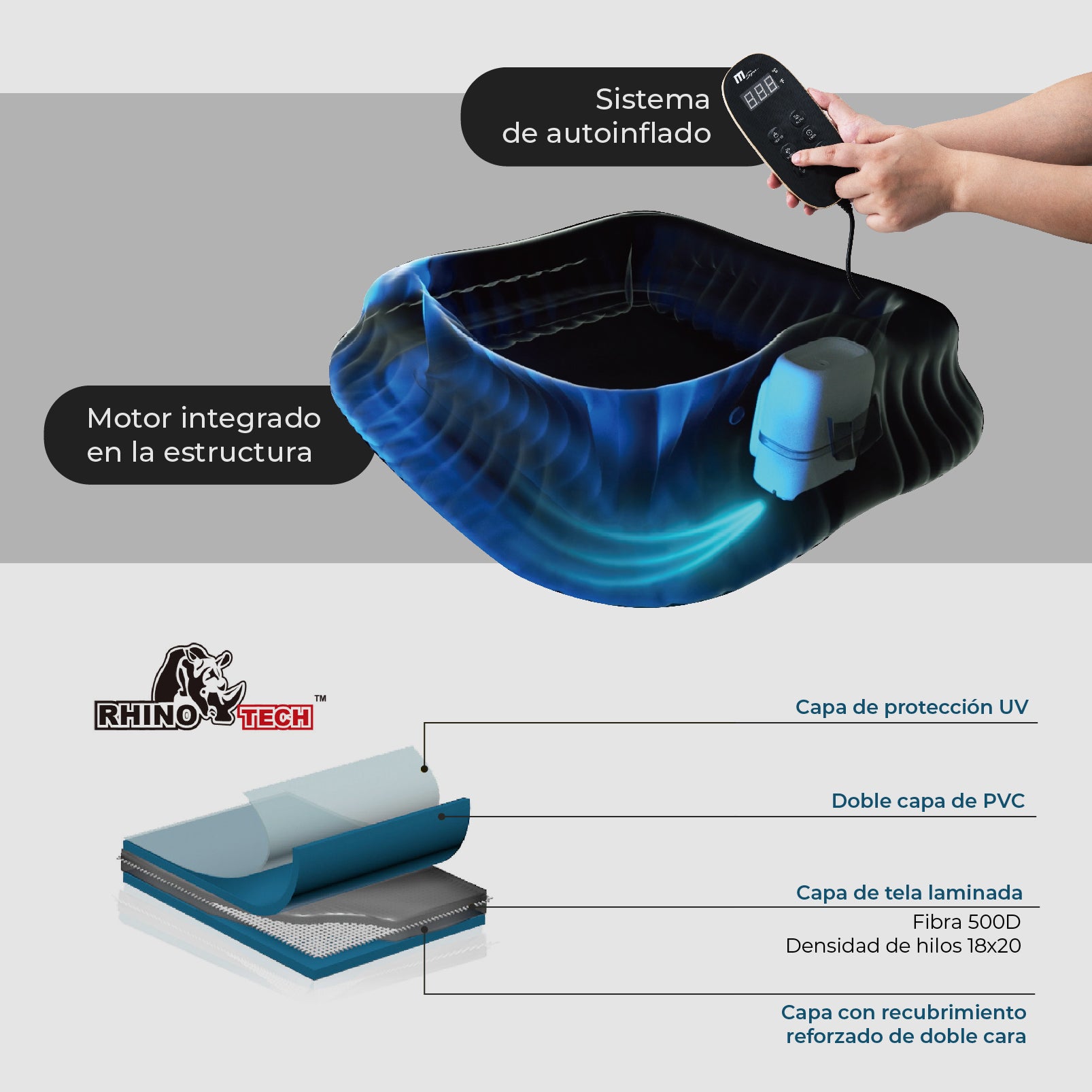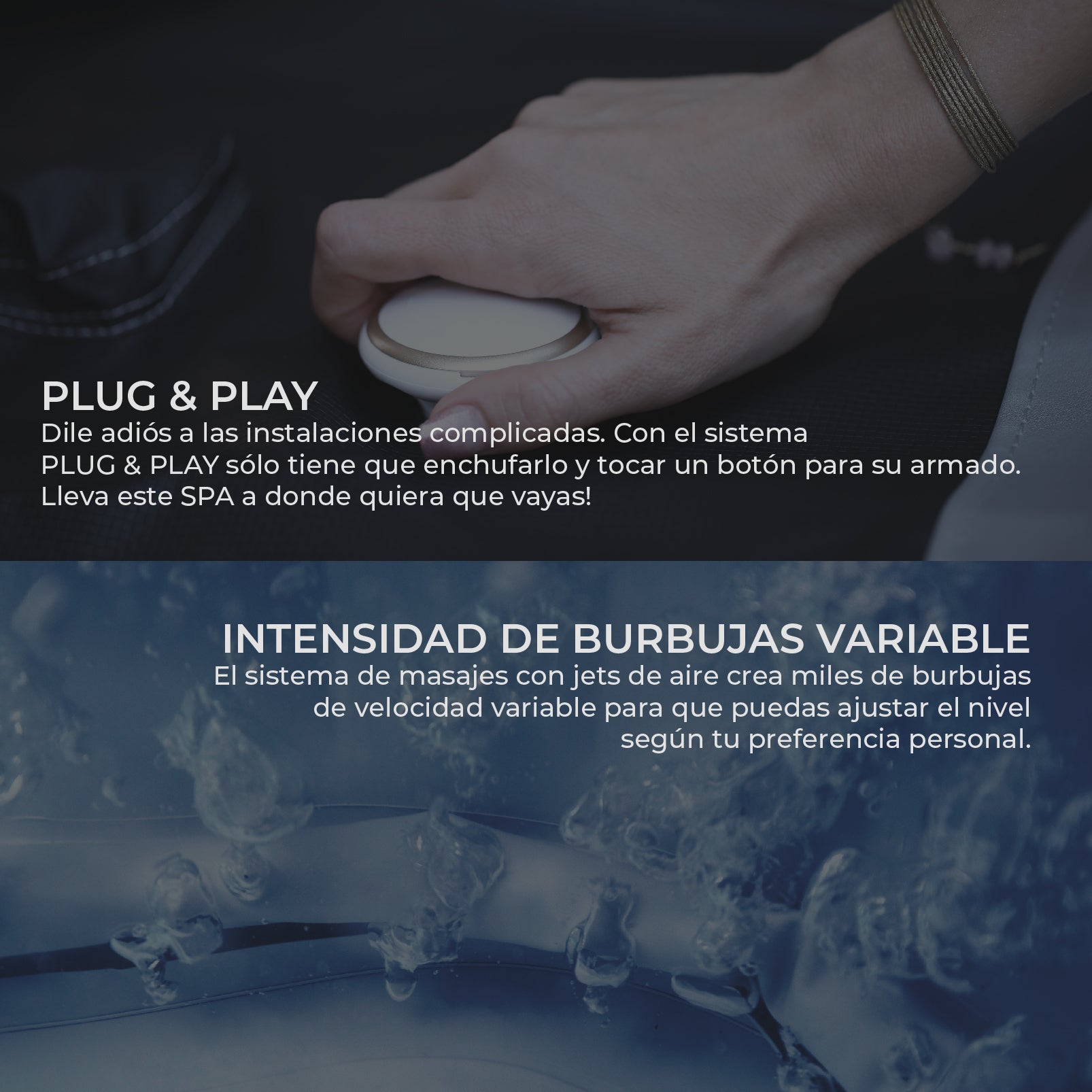 Dile adiós a las instalaciones complicadas. Con el sistea Plug & Play sólo tienes que enchufarlo y tocar un botón para su armado. Lleva este SPA a donde quiera que vayas!
