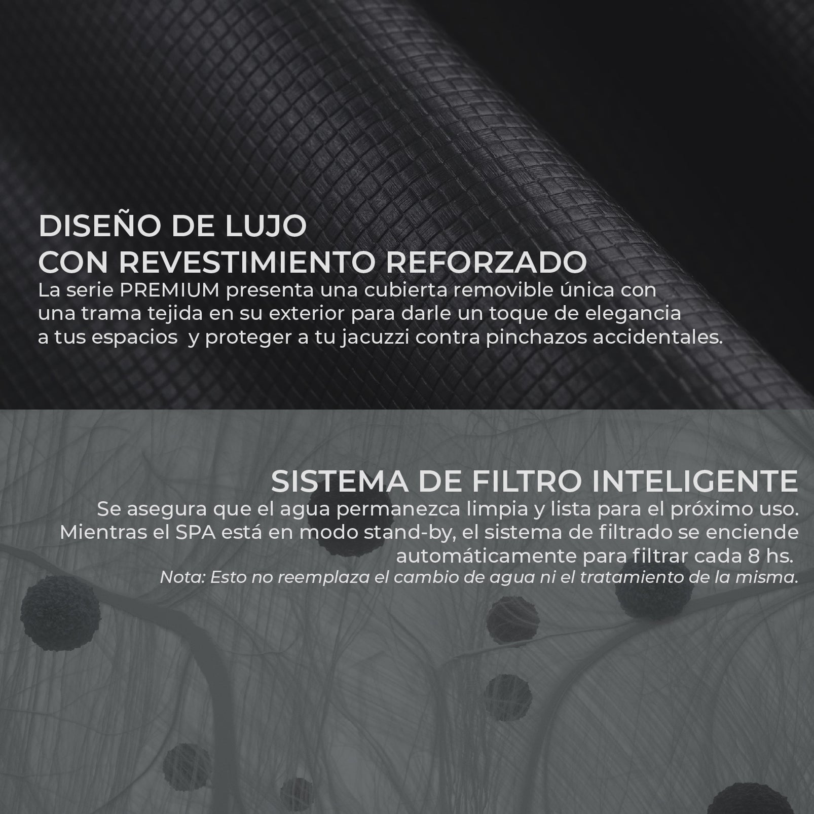 Construido para destacarse, la serie PREMIUM presenta una cubierta removible única que permite dar vida a los conceptos de diseño más atrevidos sin sacrificar la funcionalidad del spa. Este hot tub tiene una trama tejida en su exterior para darle un toque más elegante a tus espacios y protege a tu jacuzzi contra pinchazos accidentales.