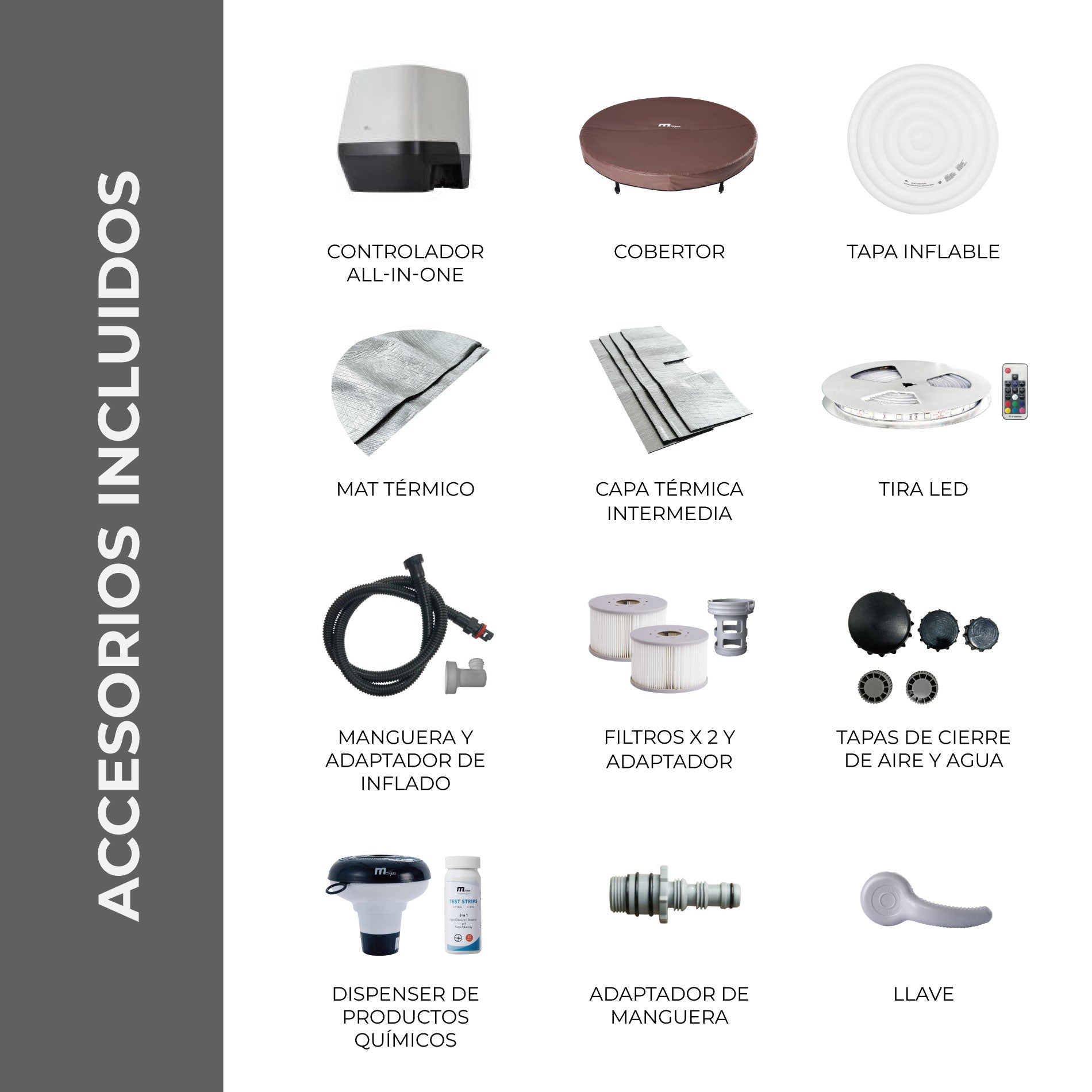 - Inyectores de agua para hidromasaje: 4 sets (8 inyectores ajustables)