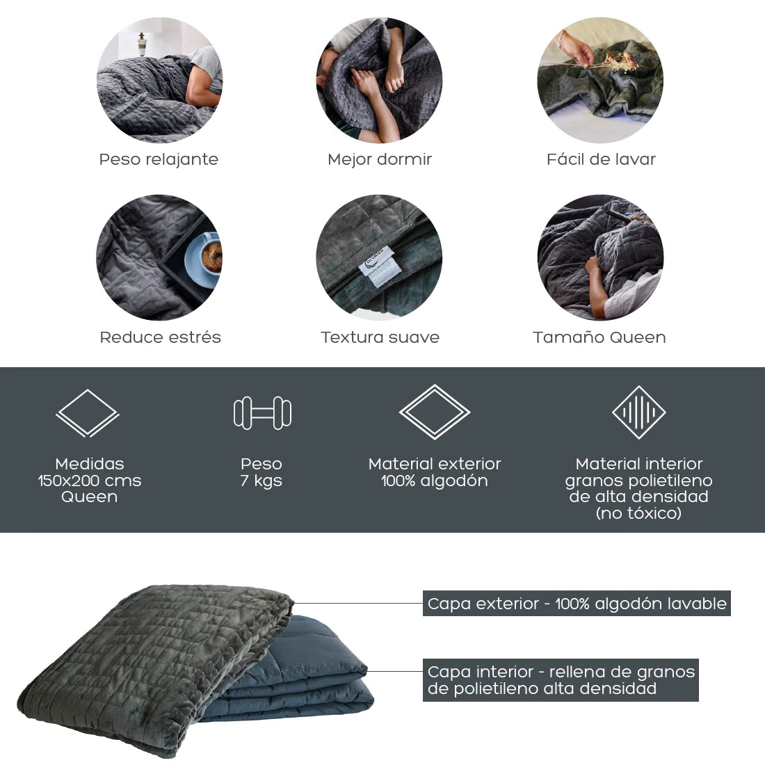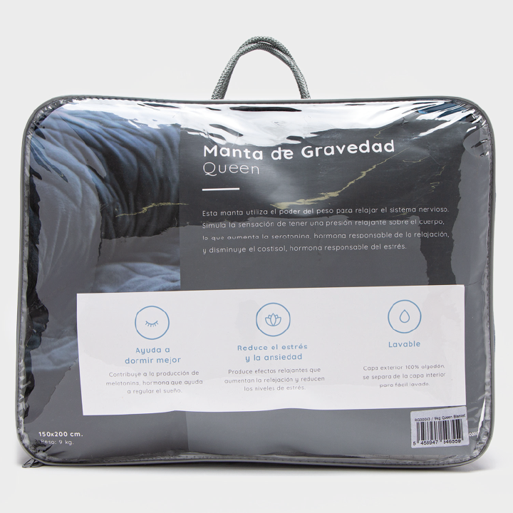 Diseñada para quienes les cuesta conciliar el sueño, esta Manta de Gravedad Queen by Relan ayuda a reducir el estrés y crea sensación de tranquilidad. Esto se logra gracias a la presión que se ejerce esta manta pesada sobre el cuerpo.