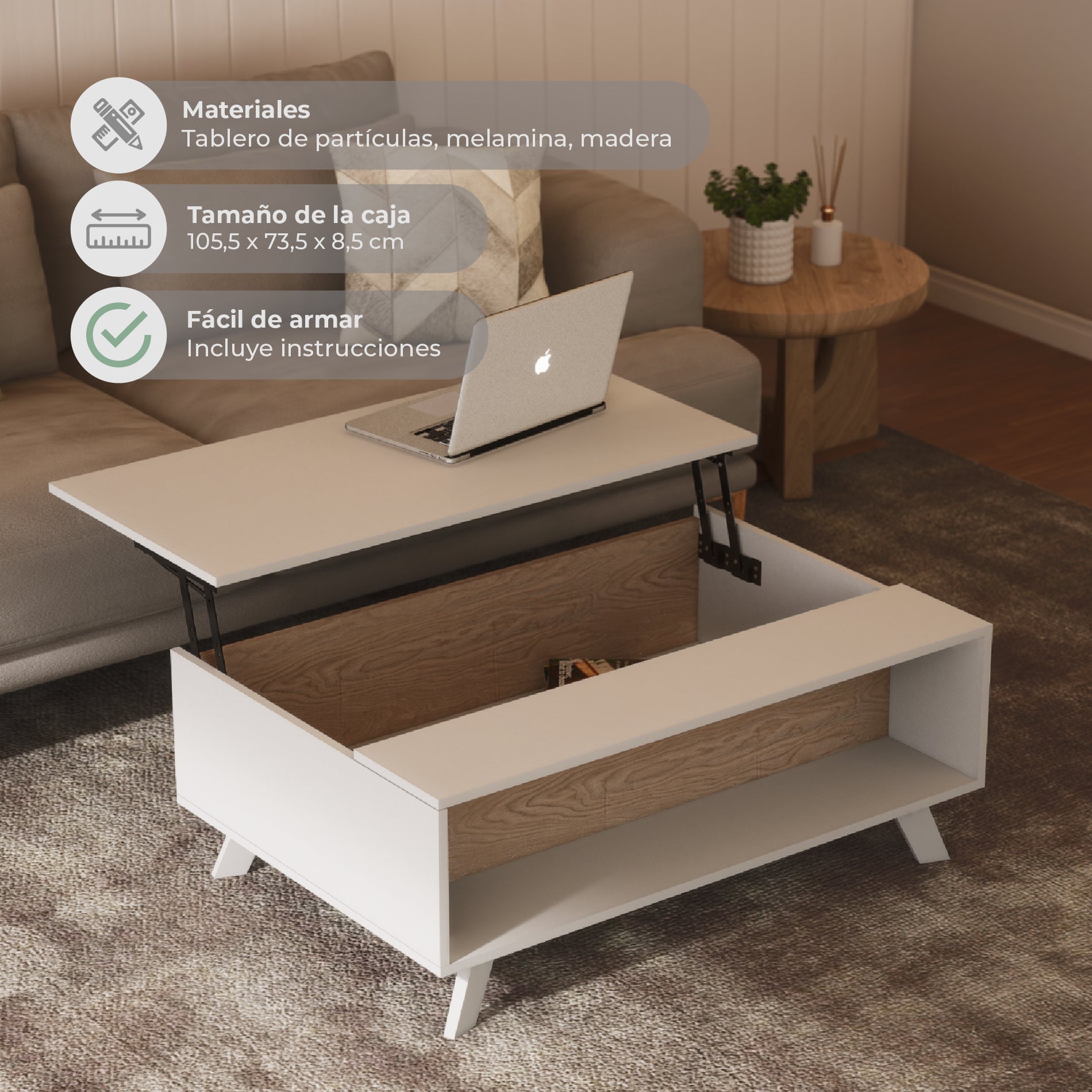 Disfruta de la Mesa de Centro Estilo Nórdico ALORIA by Relan, con un diseño práctico e inteligente esta mesa te permitirá aprovechar al máximo sus funcionalidades. Podrás elevar su superficie, obteniendo un estante en altura multiusos y también espacio de almacenamiento extra, perfecto para mantener tus espacios ordenados.