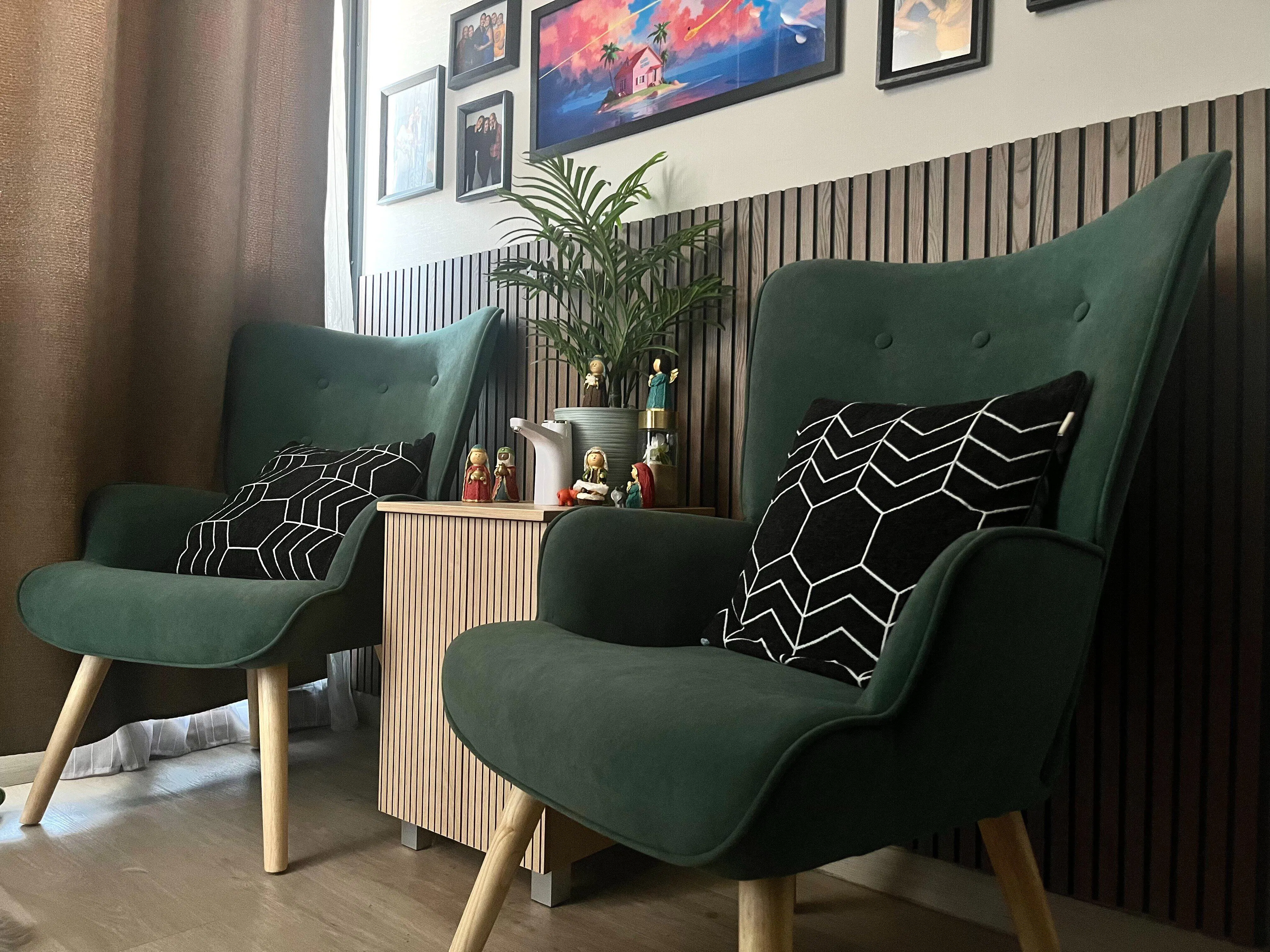 - Tanto su asiento como su respaldo son acolchados y están tapizados en un suave terciopelo verde