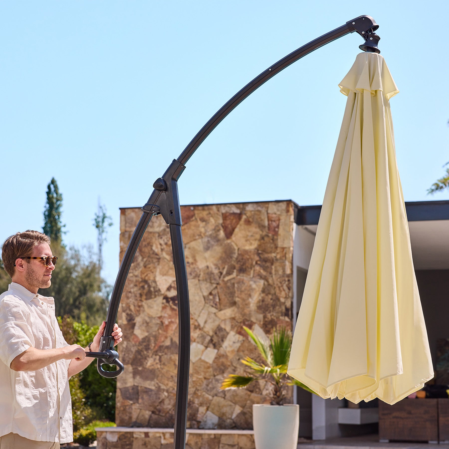 El Quitasol Lateral Con Base by Relan es el aliado perfecto para resguardarte del sol mientras disfrutas de tu jardín, patio o terraza. Viene equipado con una base que puedes llenar de agua o arena para proporcionar estabilidad generando contrapeso. Cuenta con un sistema retractil que funciona através de una manivela para abrir y cerrar la sombrilla con facilidad. Se pliega de manera compacta para su almacenamiento.