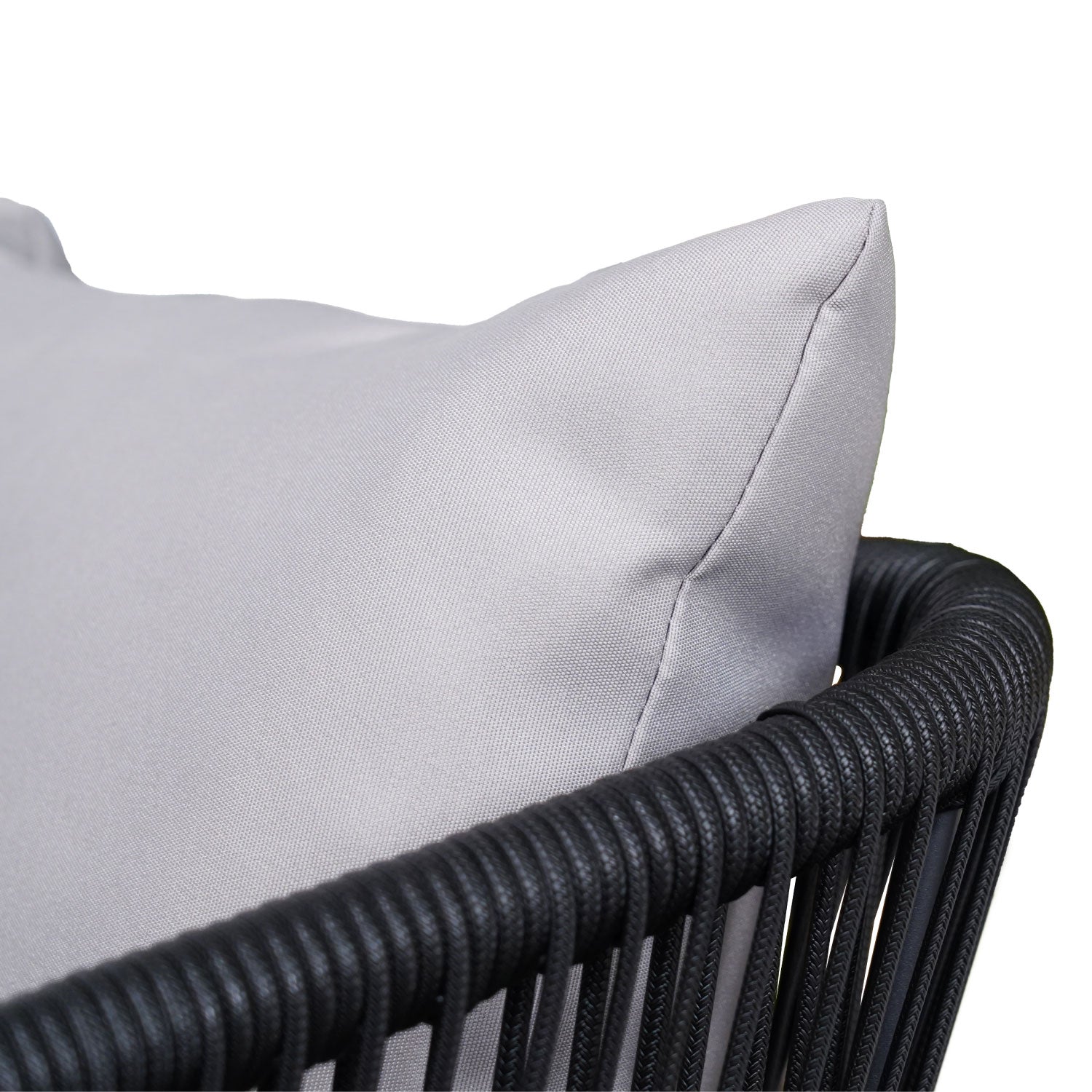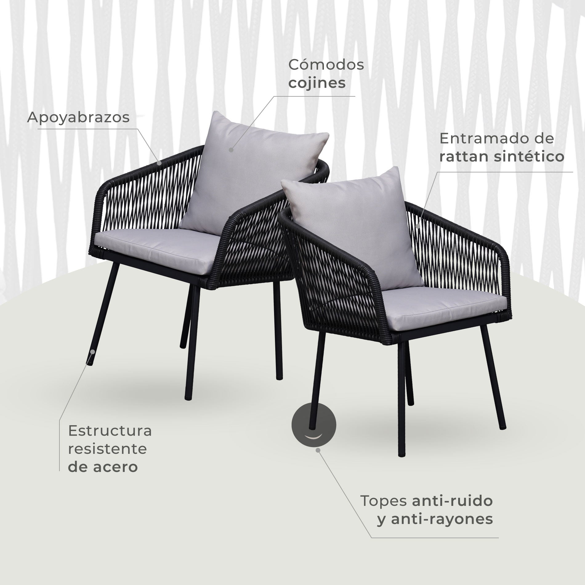 - Materiales: Ratán PE, Acero, Tela de poliéster