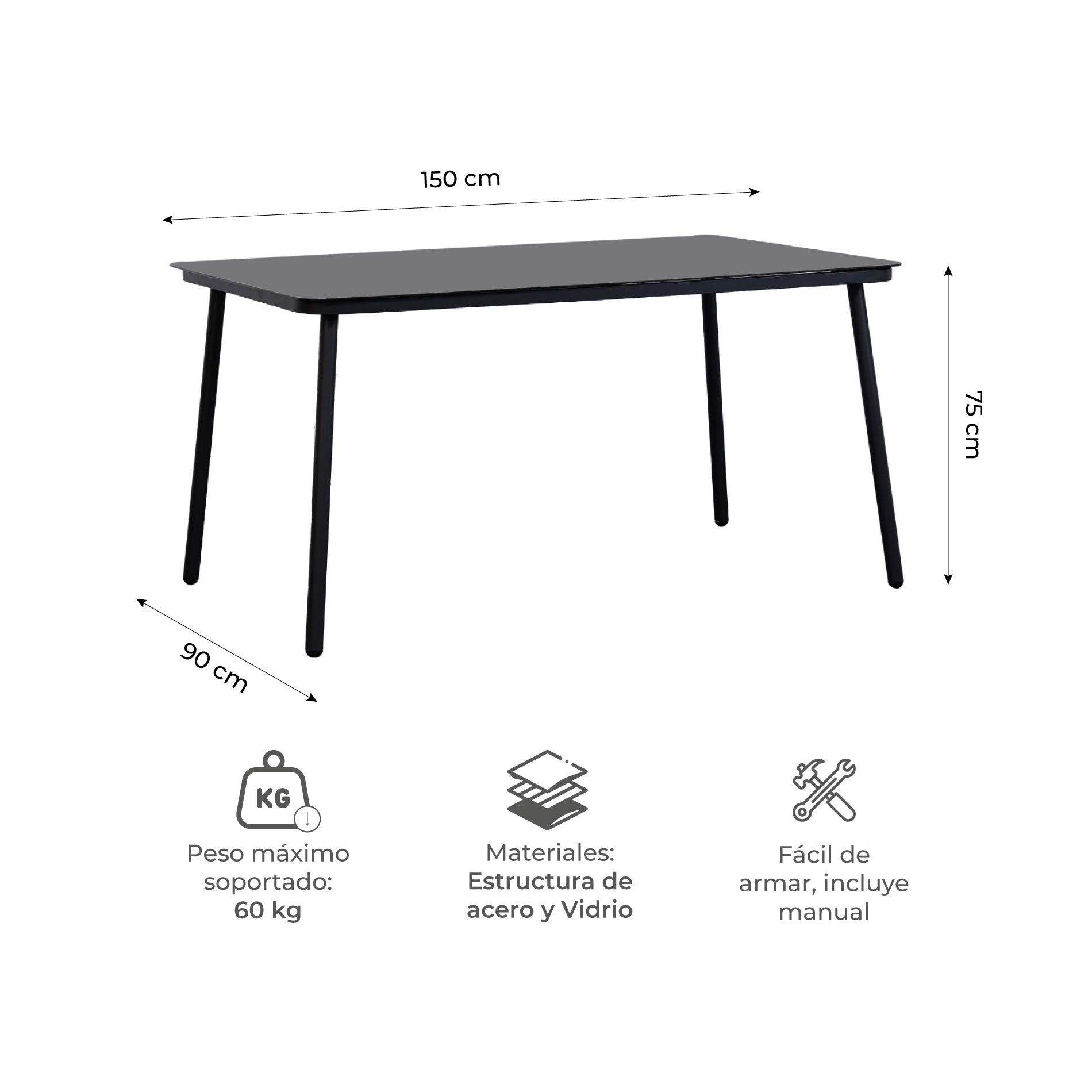 - Medidas: 150 cm largo x 90 cm ancho x 75 cm alto