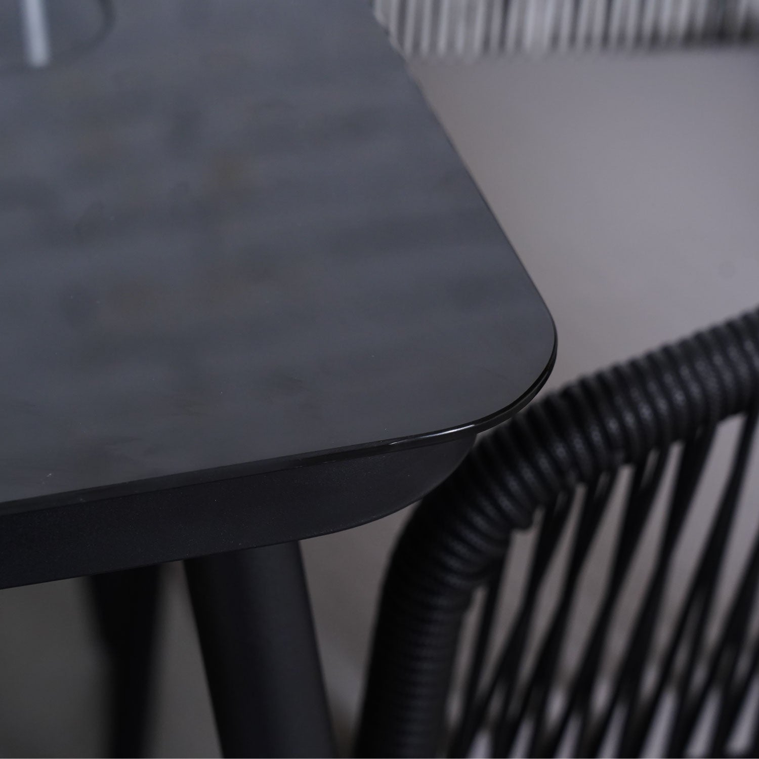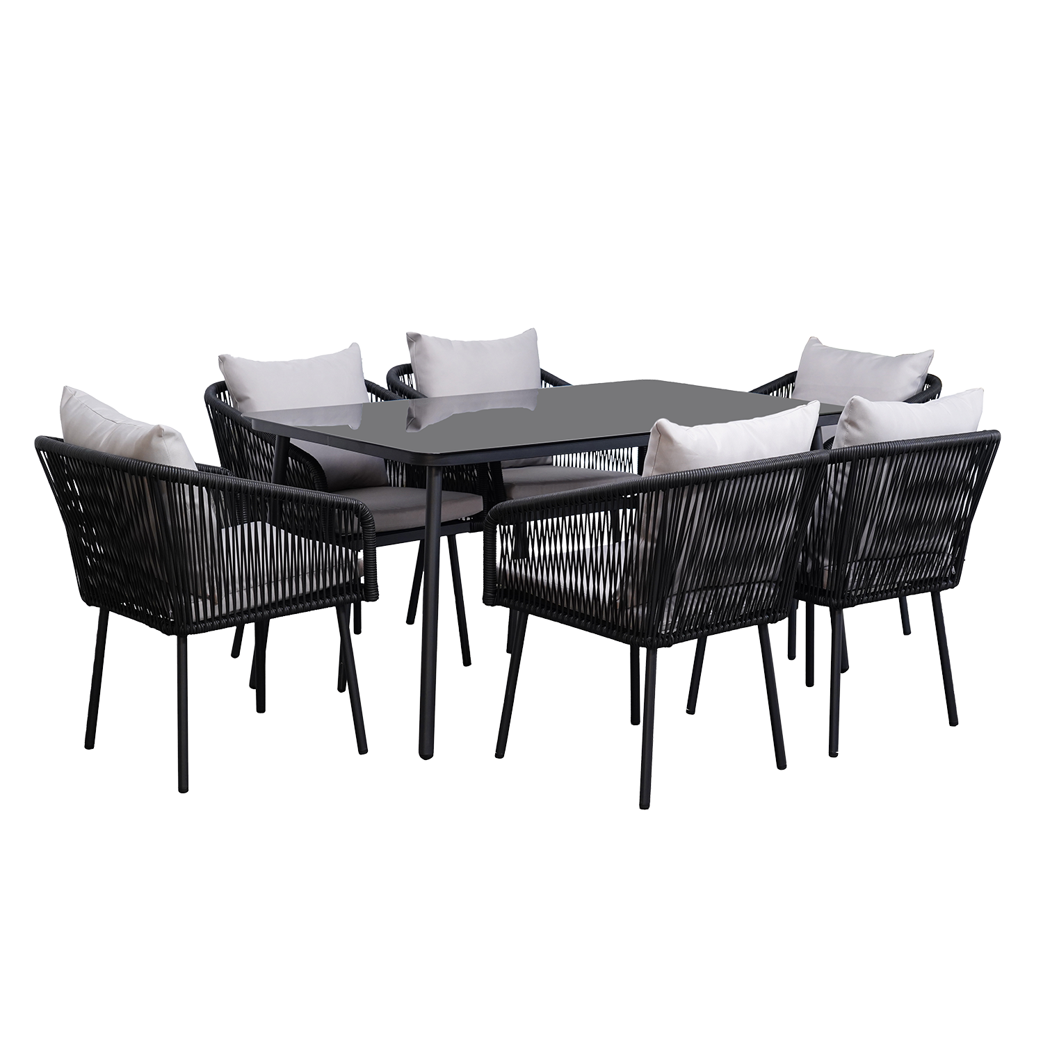 Transforma tus espacios exteriores con el Set de Mesa y Sillas para 6 Personas Samui. Las sillas, con su entramado de ratán sintético, y la mesa de acero negro y vidrio crean una combinación armoniosa y moderna, perfecta para elevar cualquier jardín o terraza.