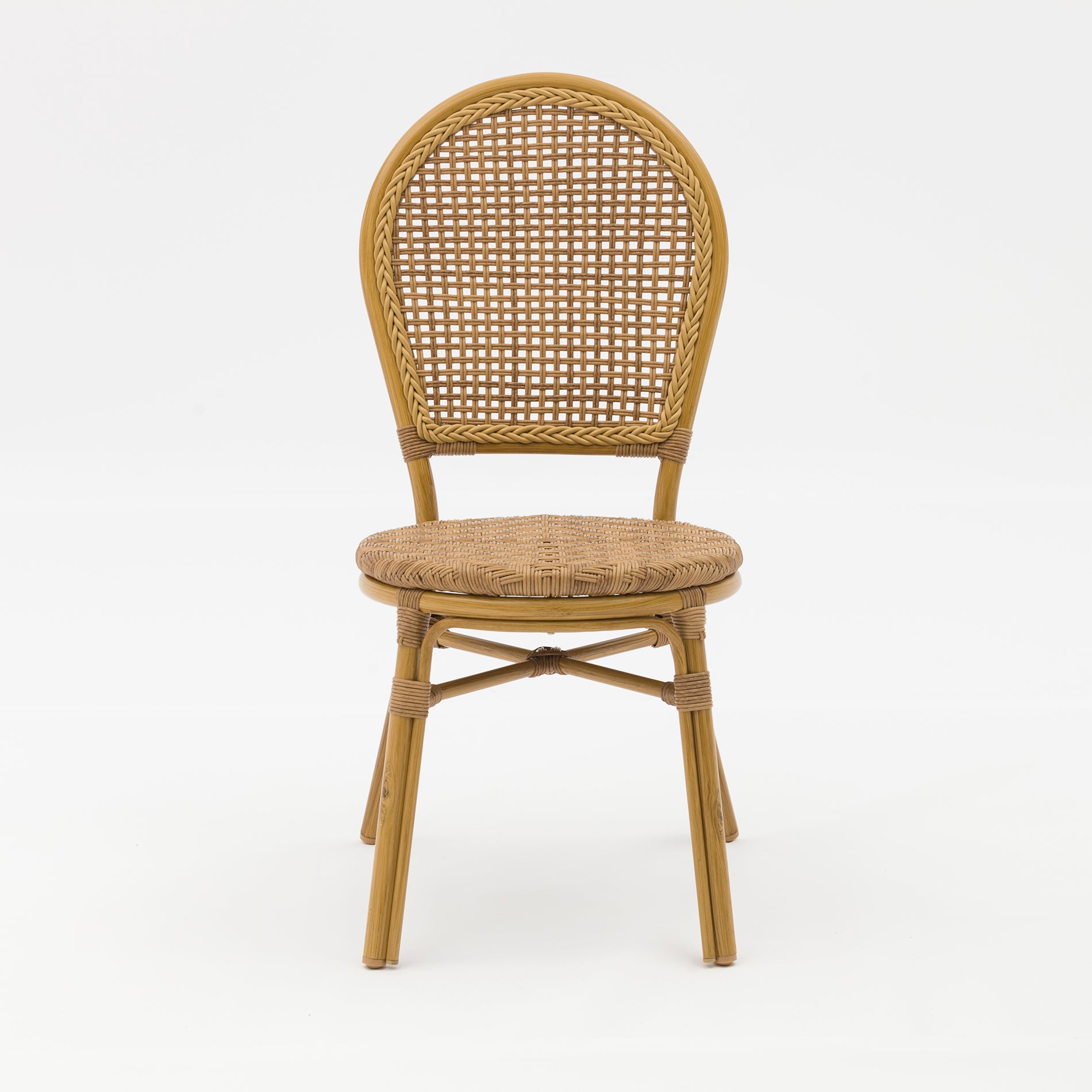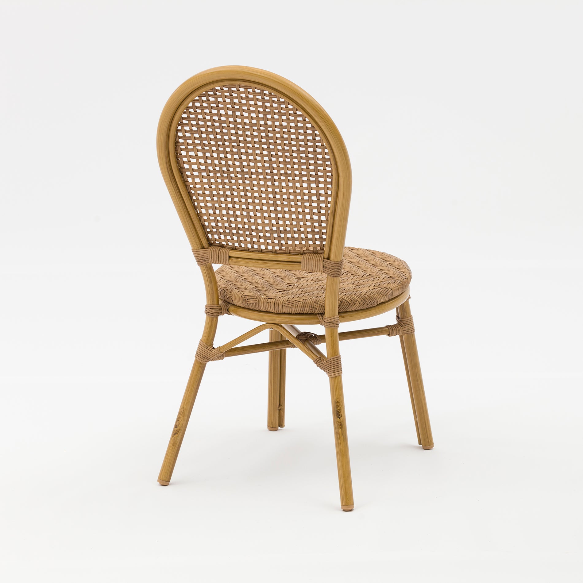 - Diseño tipo artesanal: El respaldo y asiento cuentan con un entramado de ratán, la estructura metálica tiene un acabado símil madera.