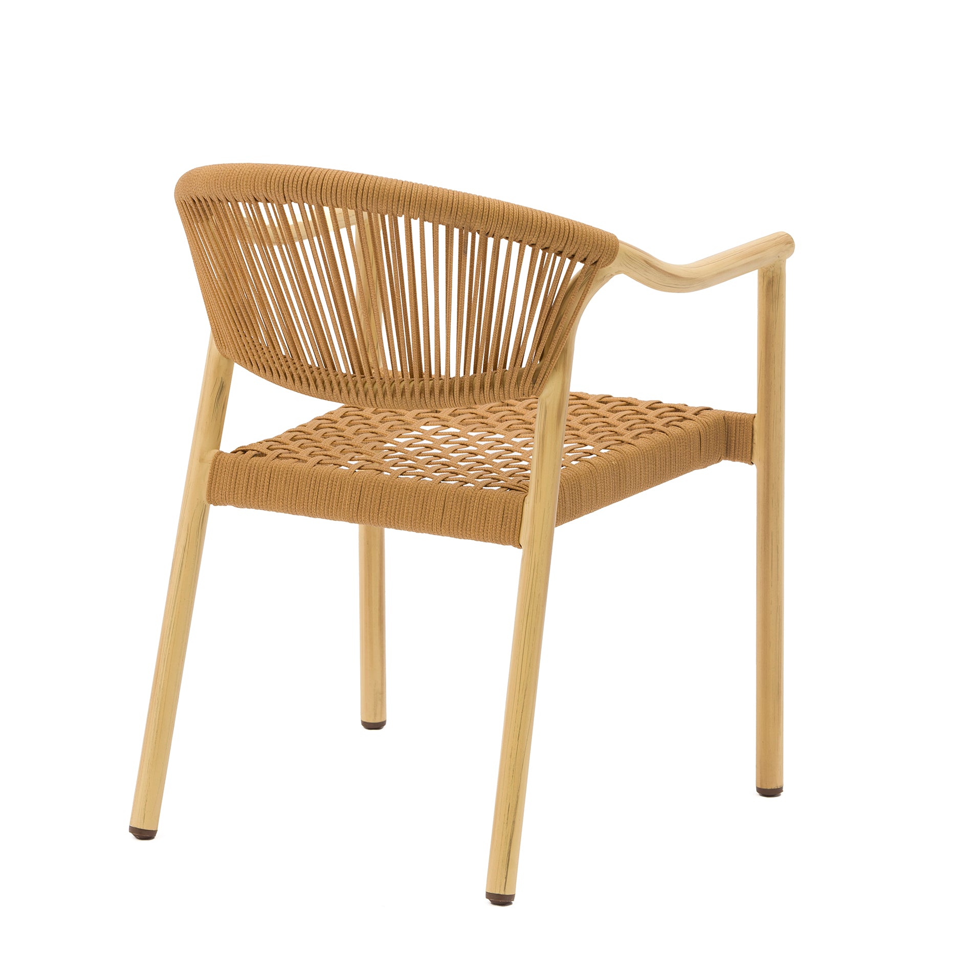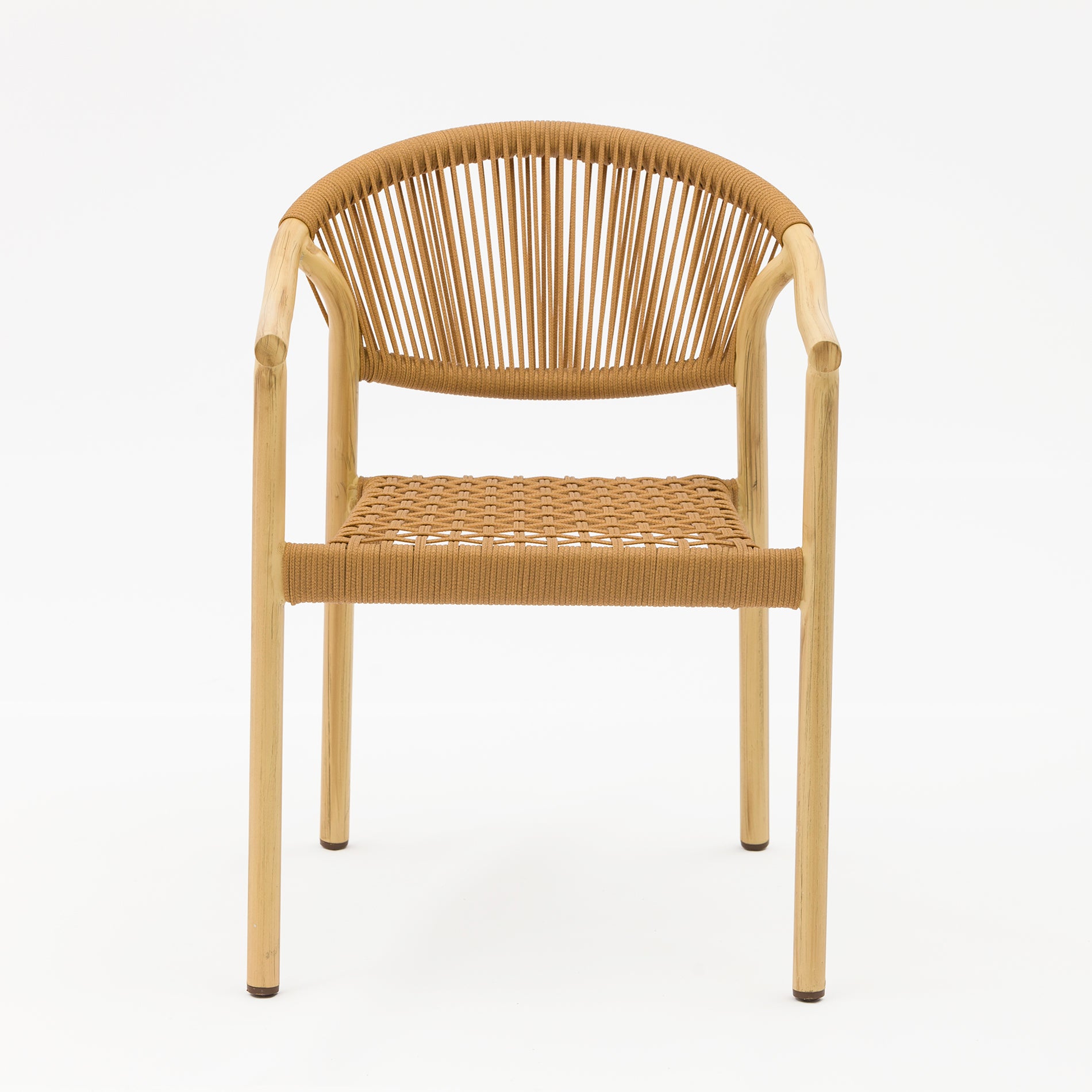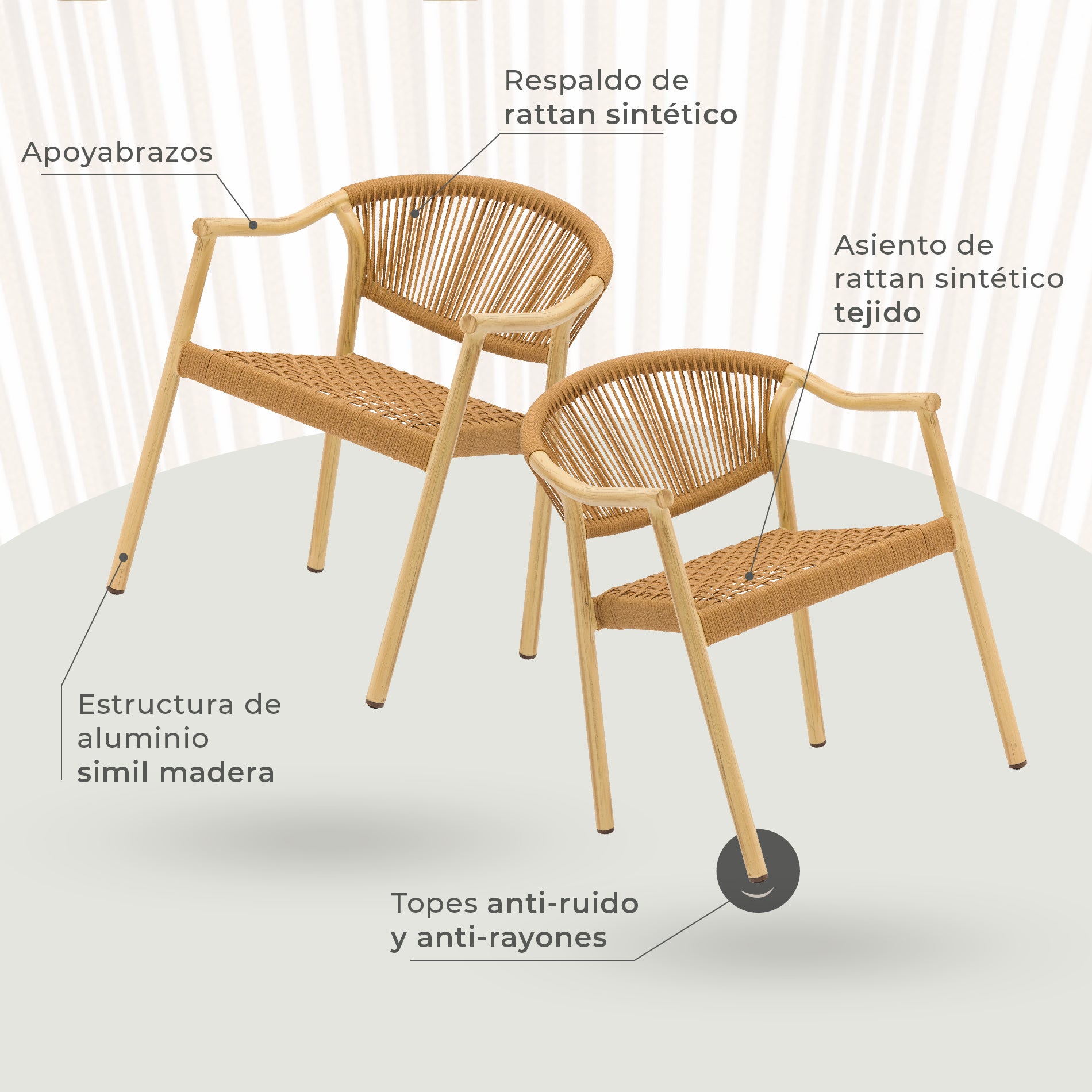 - Diseño tipo artesanal: El respaldo y asiento cuentan con un entramado de ratán, la estructura metálica con apoyabrazos tiene un acabado símil madera.