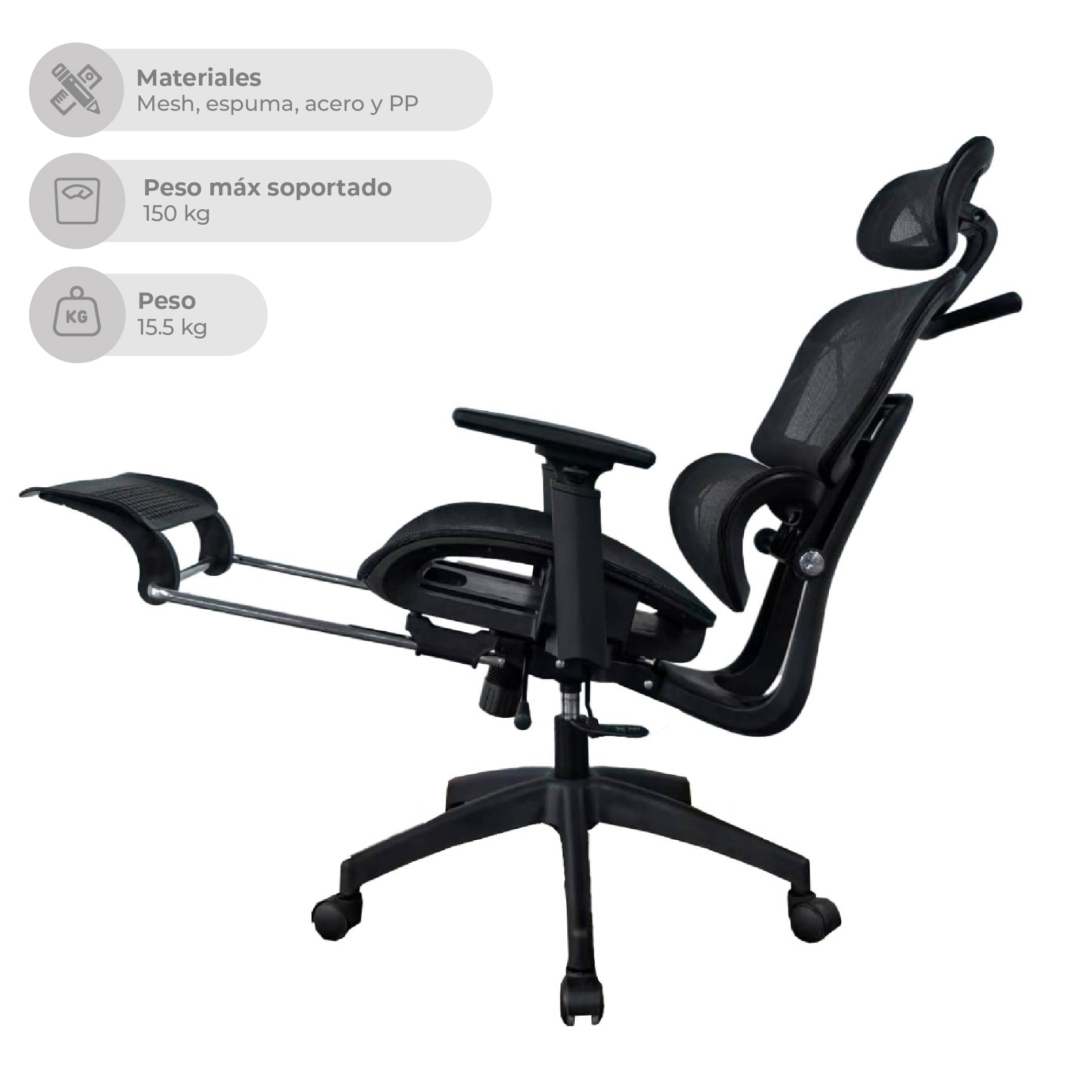 - Con apoya pies integrado y retráctil para acompañarte en tus horas de trabajo, estudio o gaming.