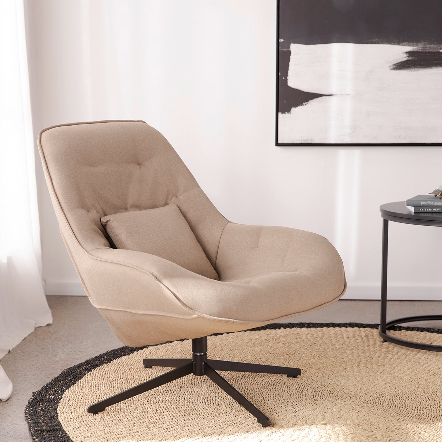 Transforma tu espacio con el Sitial Giratorio Cherry. Su diseño moderno combina textiles suaves en tonalidades neutras y diseño capitoné. Es perfecto para tener un tu propio rincón de lectura y relajación.